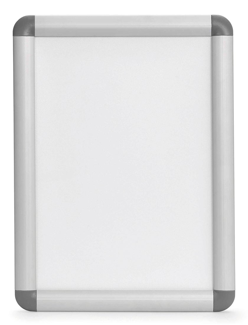Vrid upp de fyra kantstyckena, ta bort den reflexfria skyddande plastskivan och sätt upp din affisch. Sätt tillbaka kantstyckena. Klart!