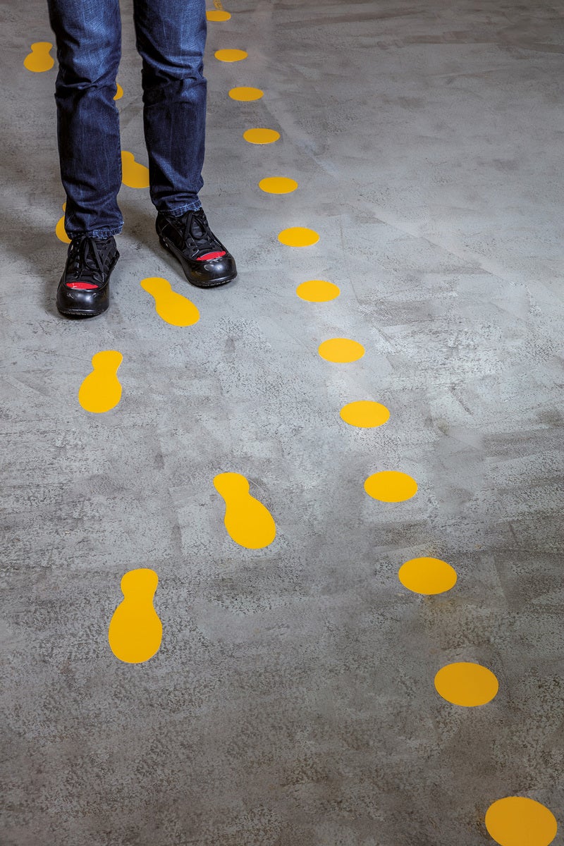 Självhäftande golvmärkningssymbol i form av fotavtryck för markering av gångzoner inomhus. Fäster på rena och torra betonggolv. Slitstarka och tåliga med halkskyddsgrad R9 i enlighet med DIN 51130.