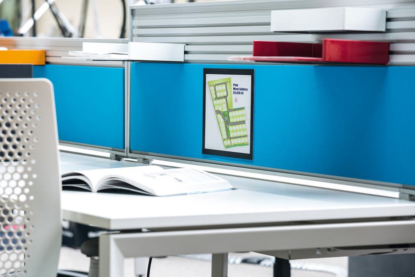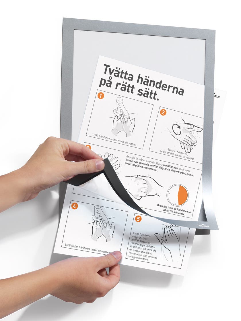 Använd DURAFRAME® GRIP inforamar för information som ska sättas upp på textilväggar, t ex telefonlistor eller lathundar som behöver finnas nära till hands. Enkelt att sätta i eller skifta budskap genom att lyfta framsidan med magnetstängning. <br<