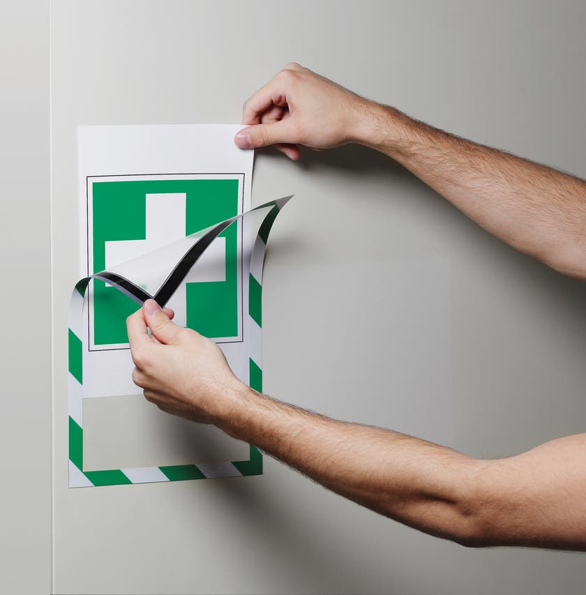 Sätt upp tillfällig eller mer varaktig säkerhets och varningsinformation på ett professionellt sätt med magnethäftande inforamar DURAFRAME® MAGNETIC SECURITY. Lägg det skyddande arket - med magnetiskt fäste längs ramens kant - över dokumentet och sätt upp på exempelvis whiteboardtavlor, omklädningsskåp och metallväggar. Klart! Snyggare och enklare hantering än t ex tejp.