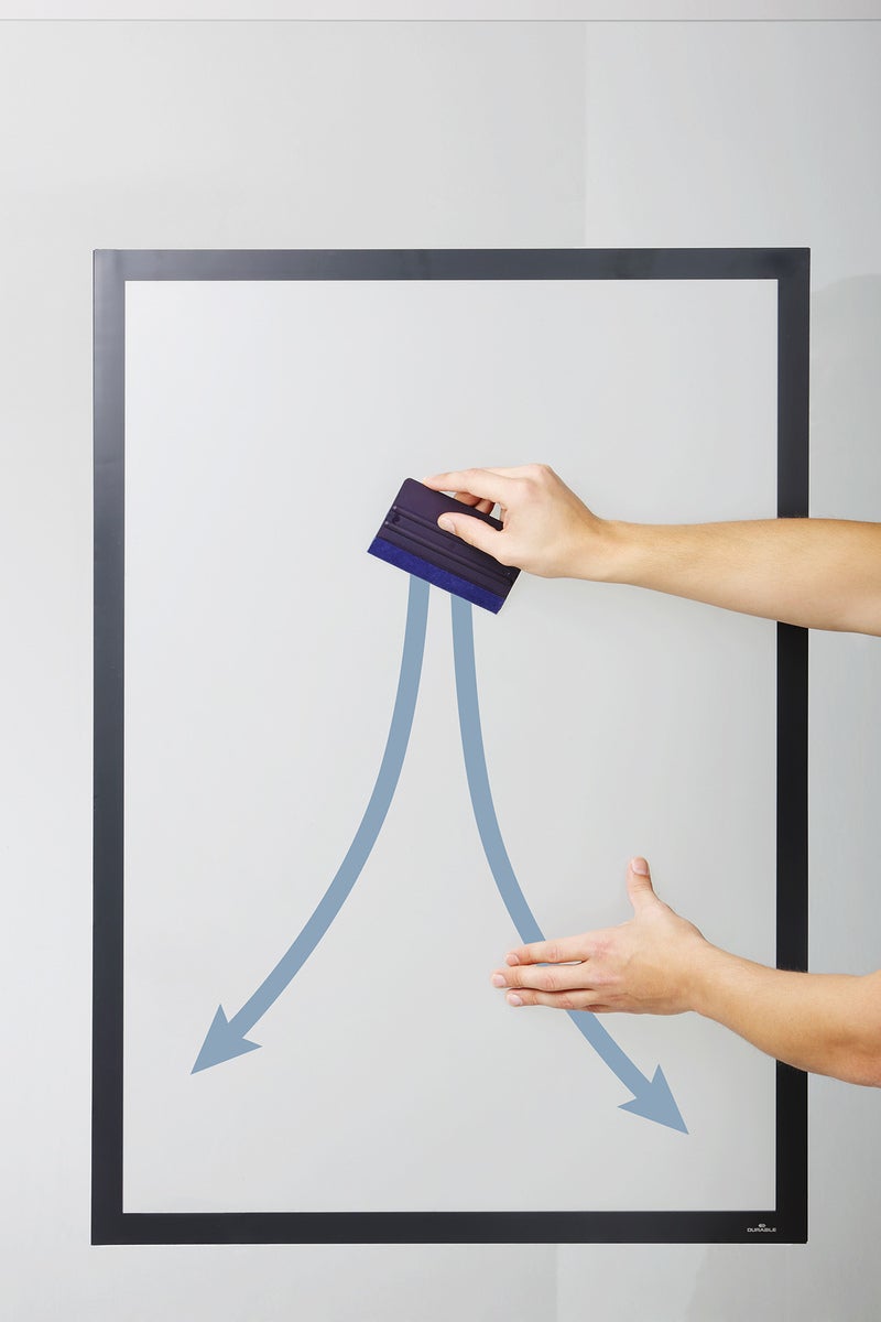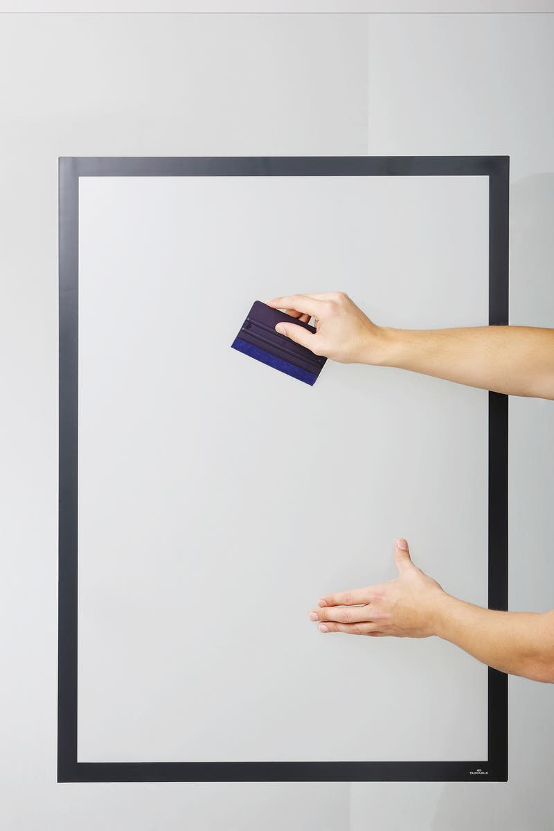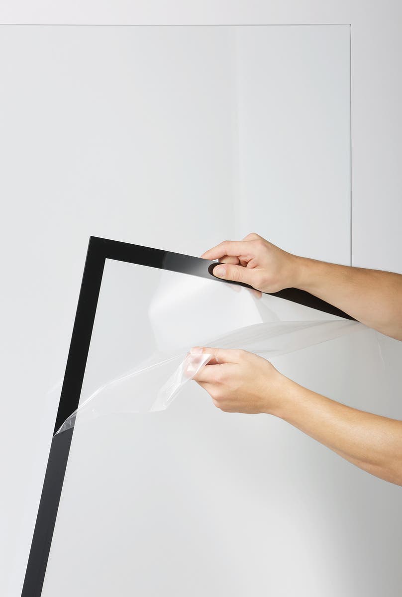 Enkelt att sätta i eller skifta budskap genom att lyfta framsidan med magnetstängning. Lätt att sätta upp - spraya bara lite vatten utblandat med en droppe diskmedel på baksidan så fäster ramen statiskt på glasytan. Snyggare än tejp! Kan användas flera gånger och lämnar inga spår efter sig.