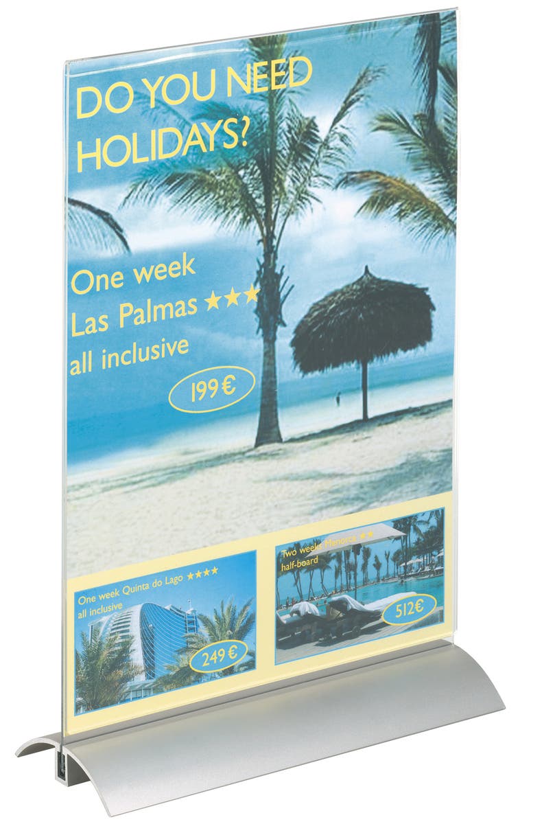Elegant bordsställ med T-fot, för skyltning av information, menyer, reklam, på mässor mm. Transparent panel i akrylplast och fot av aluminium. Enkelt att byta informationsblad. Läsbar från två håll – utrymmesbesparande.