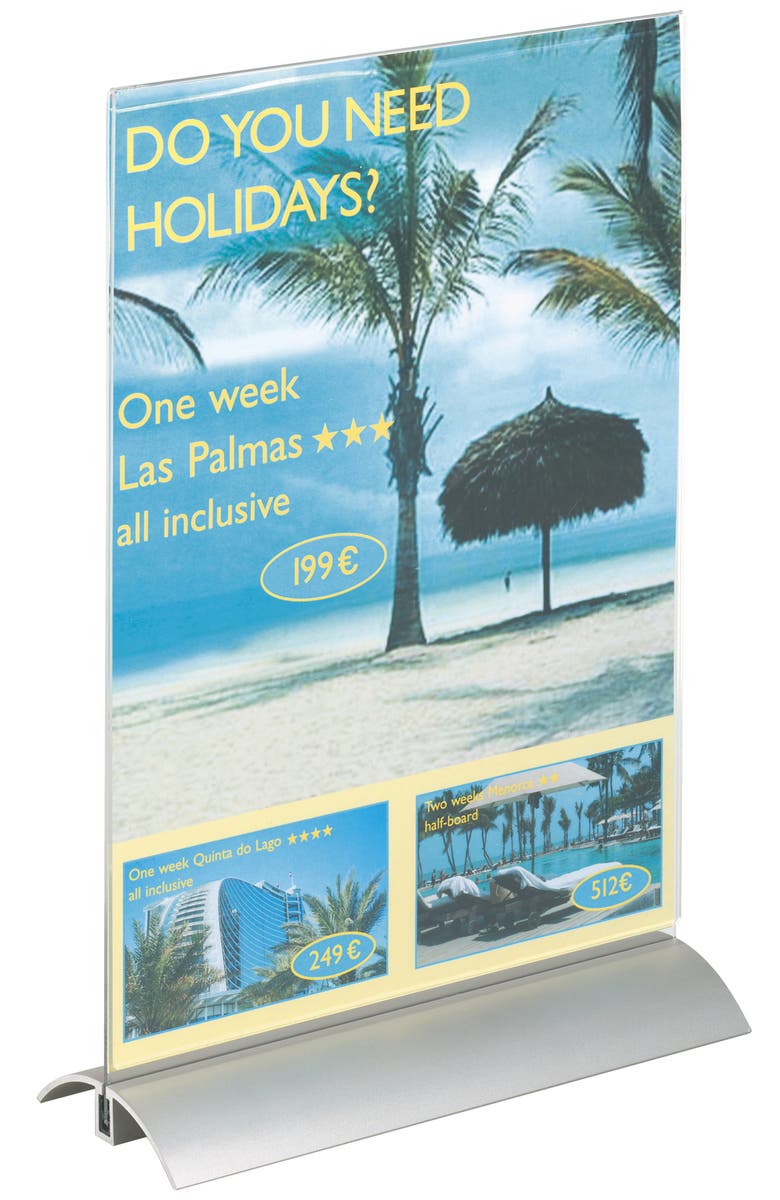 Elegant bordsställ med T-fot, för skyltning av information, menyer, reklam, på mässor mm. Transparent panel i akrylplast och fot av aluminium. Enkelt att byta informationsblad. Läsbar från två håll – utrymmesbesparande.