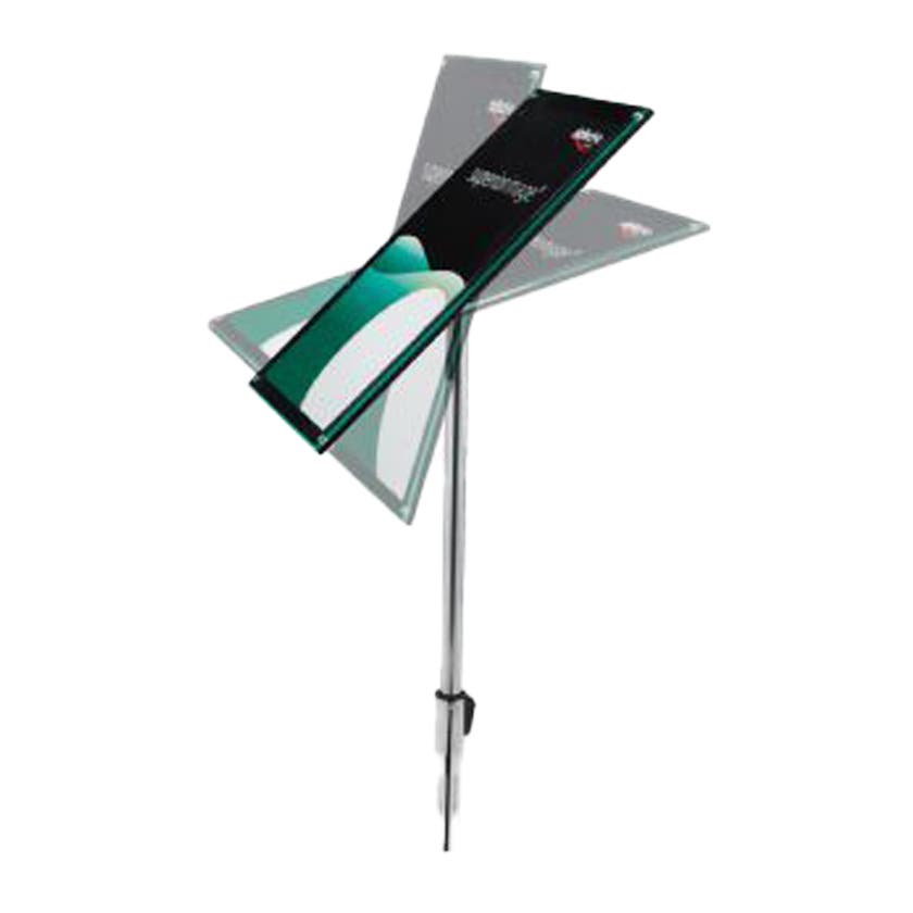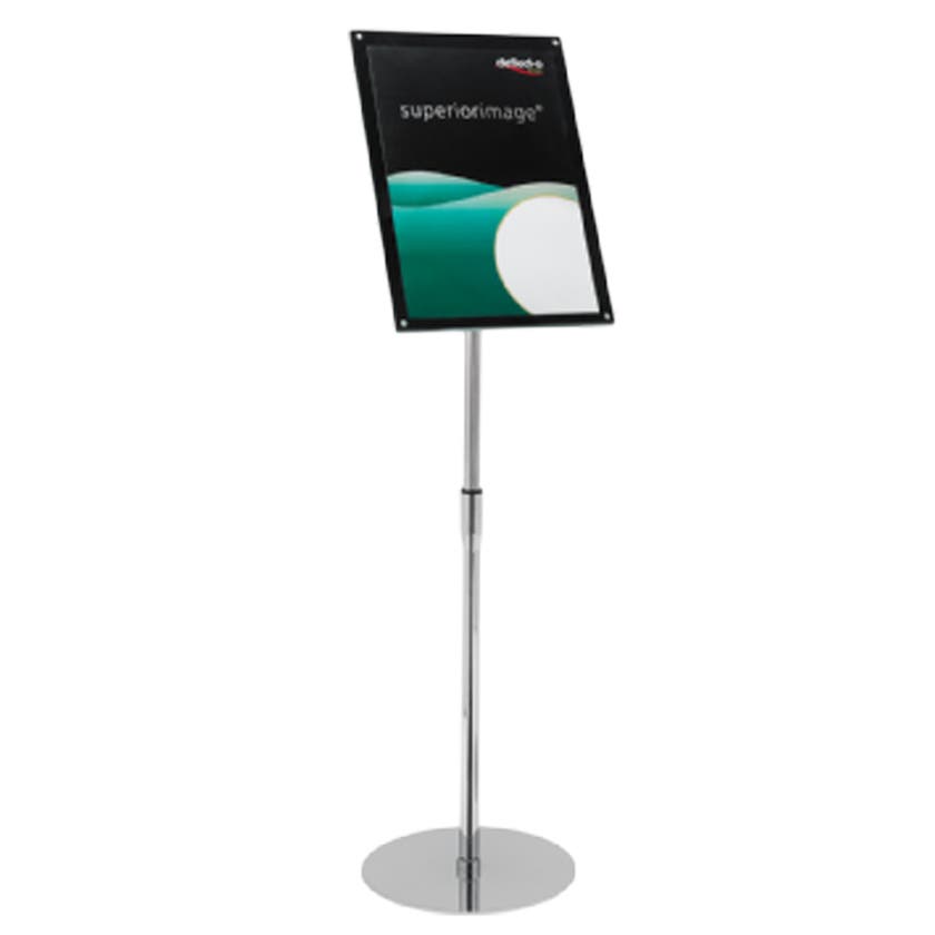 Informationsställ med baksida i svart akryl och glasklar akryl som täckskiva. Täckskivan har elegant fasade kanter och fästs med magneter. Informationstavlan har justerbar vinkel. Stolpen är höj- och sänkbar. Finns i två storlekar.