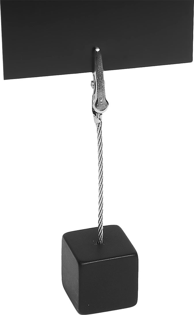 Korthållaren står stabilt på bord tack vare den lilla kuben nertill. Krokodilklämman kan användas till skyltning av varor, dukning, bordsplacering, foto-hållare eller annan Kom-i-Håg! - påminnare.
