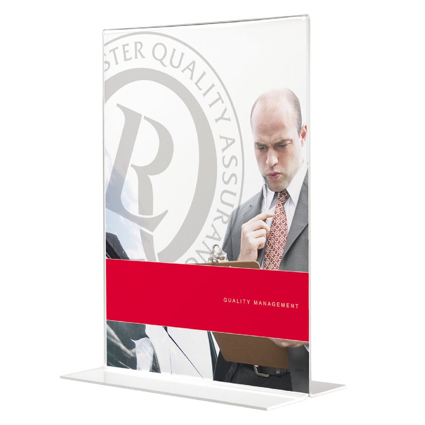 Office Depots skyltställ med T-fot för uppställning av skyltar, information, menyer mm. Displaystället är lämpligt att placera vid en receptions-, restaurangdisk eller andra offentliga platser, där det behöver vara praktiskt och enkelt att presentera information och få kundens uppmärksamhet. Enkelt och snabbt byter du meddelande i ramen. * Tillverkade av glasklar / transparent polystyren * Läsbar från två håll * En storlek för varje typ av information * Finns i både stående och liggande format * Finns i flera olika storlekar