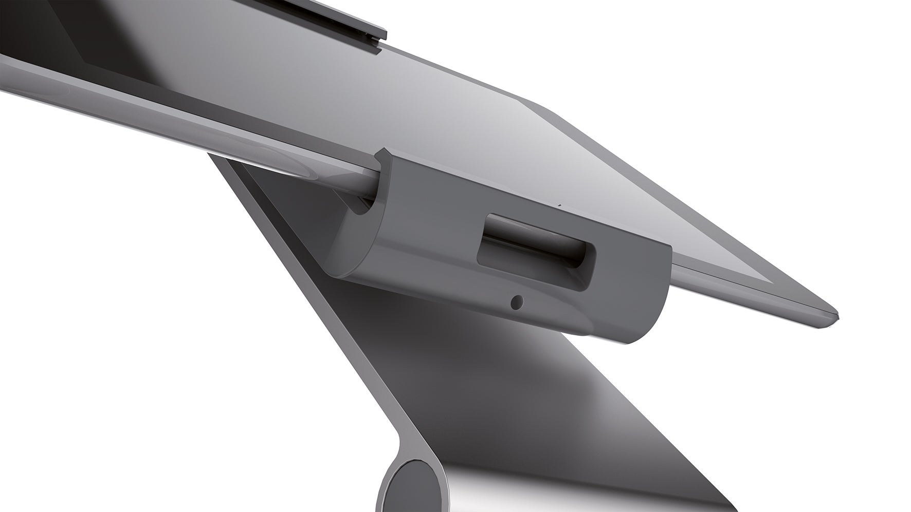 Hållaren, med gummibelagda ytor som skyddar surfplattan från repor och skador, kan vridas 360° med fyra stopplägen vid varje 90°, för användning i stående eller liggande format. Surfplattan är enkel att sätta i och ta ur hållaren, som låses med en särskild nyckel för att förhindra stöld. Dessutom går hela bordsstativet att låsa fast med ett externt kabellås "Minisaver mobile lock" från Kensington. Laddningskabeln ansluts genom en öppning i hållaren.