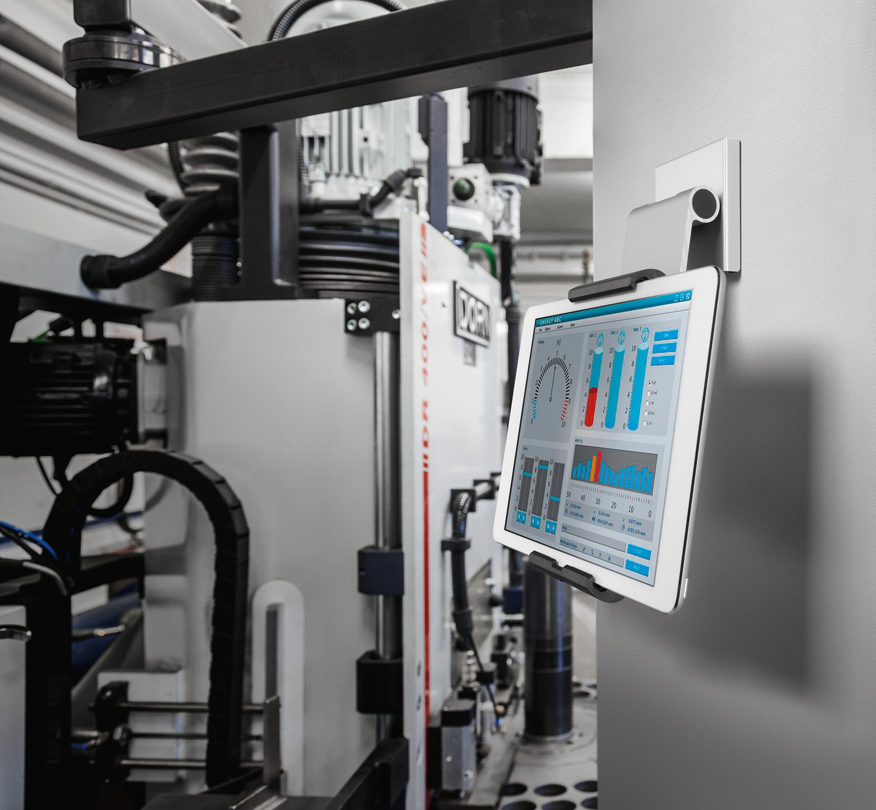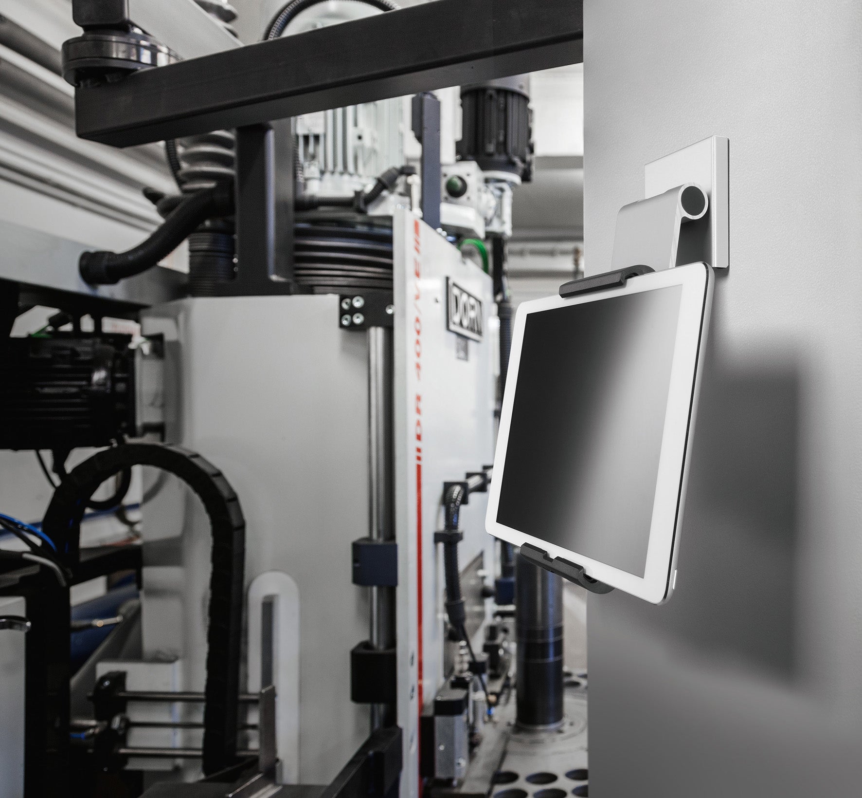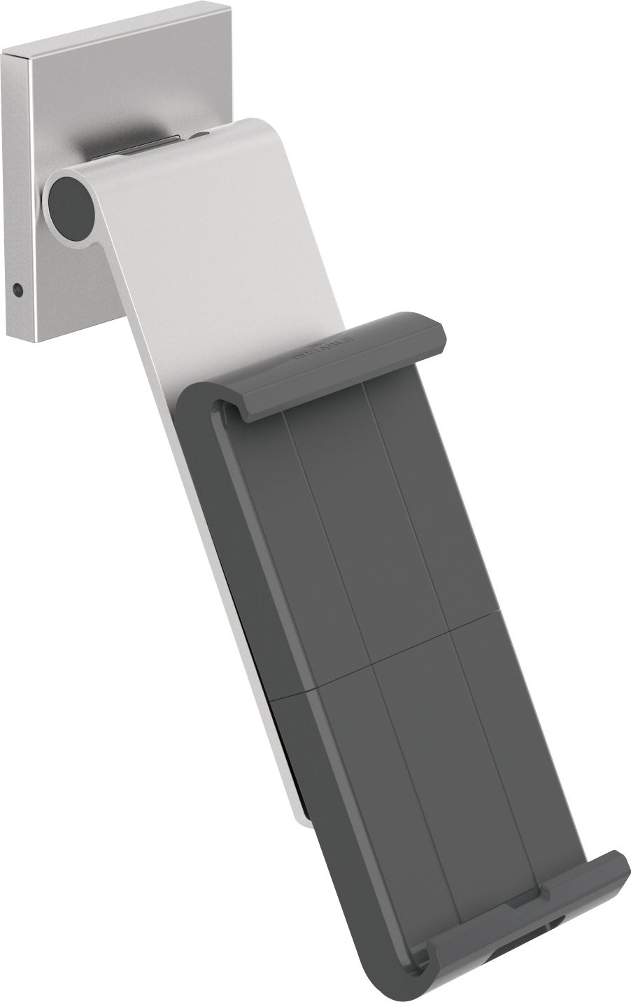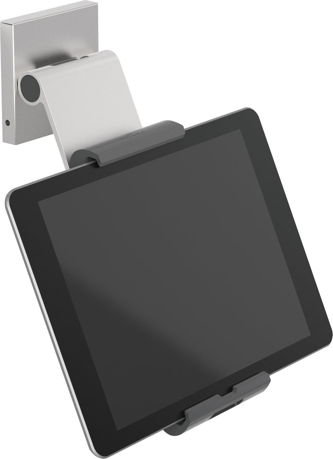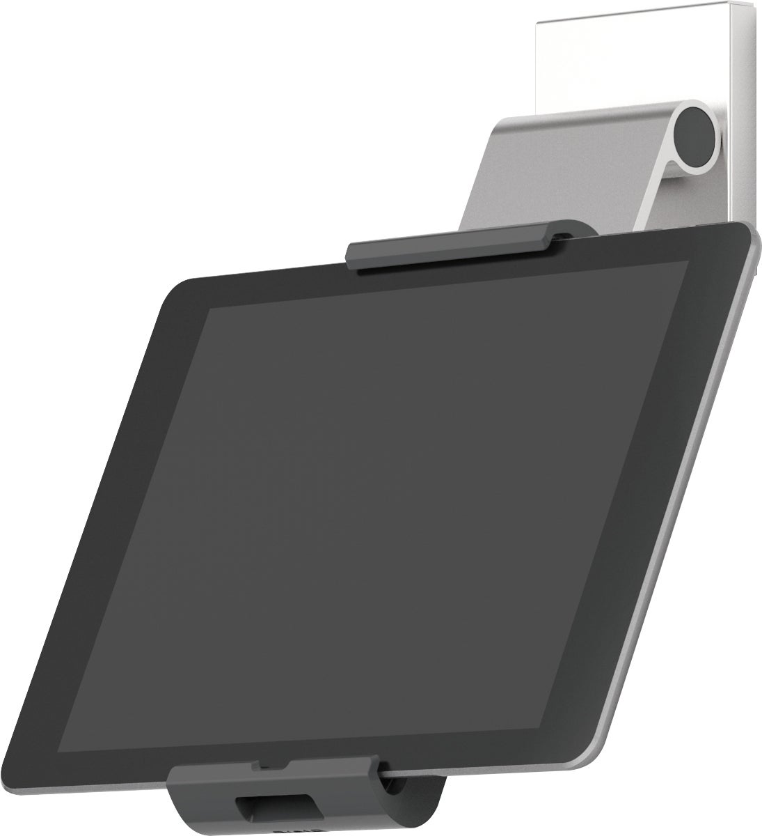 Vägghållare Tablet Holder Wall Pro i silver. Väggmonterad hållare för surfplattor med vinkeljustering har ett brett och flexibelt användningsområde t ex i produktionsanläggningar, men också för privat bruk.