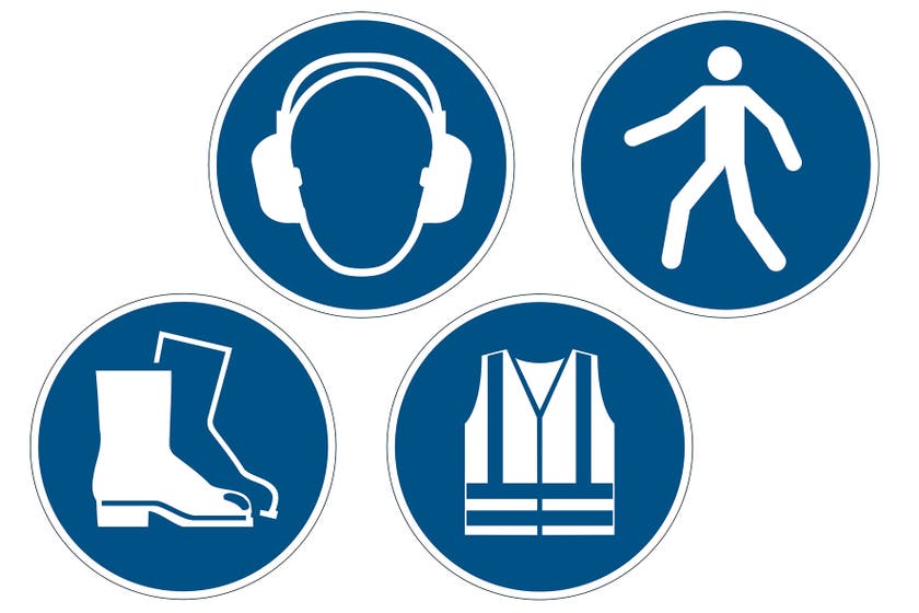Fäster på rena och torra betonggolv. Slitstark och tålig med halkskyddsgrad R9 i enlighet med DIN 51130. Skyltarna uppfyller kraven i ISO 7010.