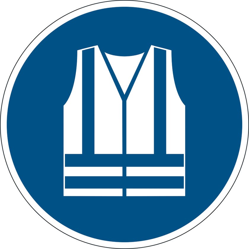 Självhäftande stor golvdekal "Använd varselkläder" upplyser tydligt besökare och personal att använda säkerhetsväst eller liknande för att synas ordentligt och minska risken för olyckor.