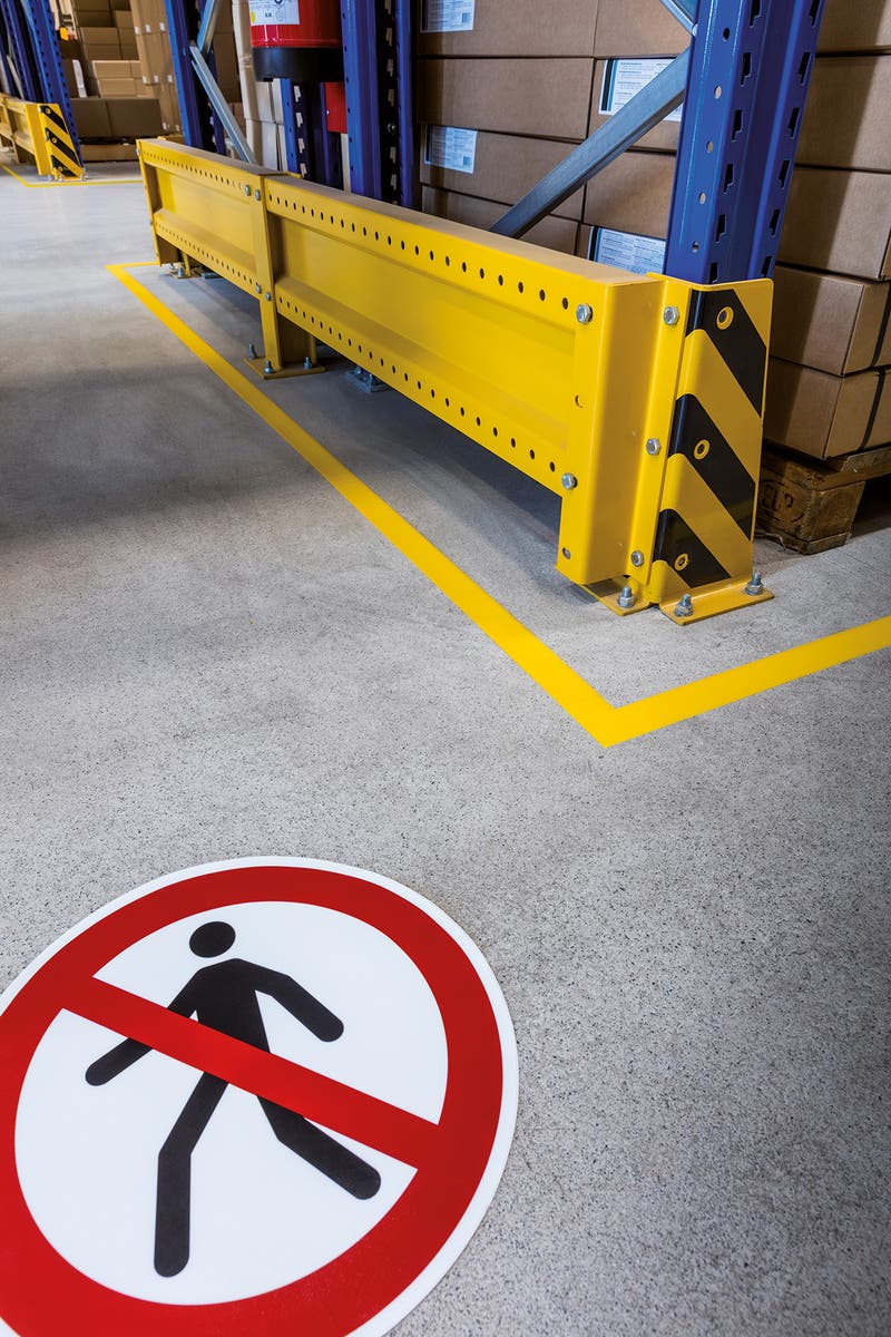 Fäster på rena och torra betonggolv. Slitstark och tålig med halkskyddsgrad R9 i enlighet med DIN 51130. Skyltarna uppfyller kraven i ISO 7010.