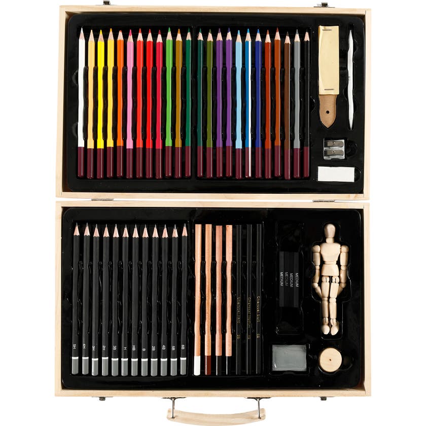 Skiss- och ritset i trälåda. Ett riktigt bra startset till dig som älskar att rita. Här finns allt du behöver, till såväl detaljerande ritningar med skuggläggningar och färger, samt till skisser/croquis och kolteckningar efter levande modeller eller en liten modelldocka. Allt sammans i en fin träväska.