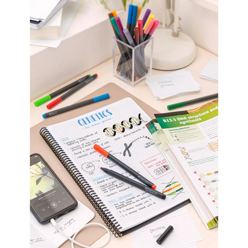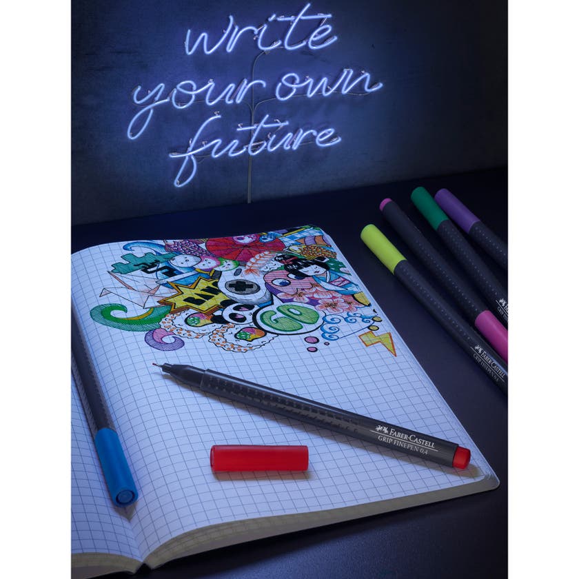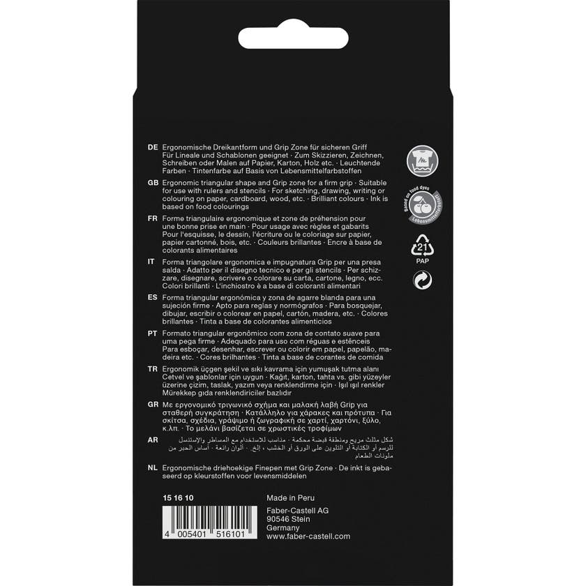 Högkvalitativ fiberpenna från Faber-Castell med grip dots för ett halkfritt grepp. Pennkroppen är triangulärt formad för en ergonomisk anvädning som är lika optimal för vänster som högerhänta. Med en lång och fin metallförstärkt fiberspets i optimala 0,4mm blir pennan idealisk för tunna linjer, detaljer och använding med linjaler samt schabloner. Vattenbaserat bläck som är tillverkad av livsmedelsnära ämnen vilket gör dem enkla att tvätta bort från hud och kläder.