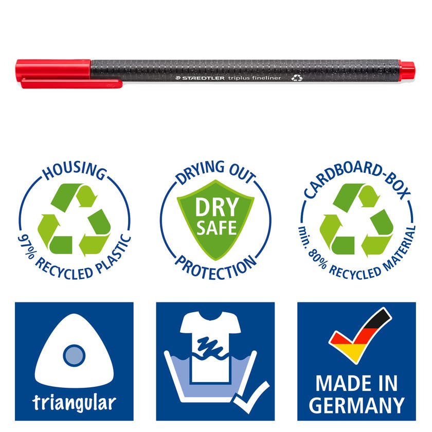 Ergonomiska trekantiga fiberpennor Fineliner från Staedtler, med hög skrivkomfort för avslappnad och skön skrivning. Förvaras i den smarta stand-up boxen. Fineliner med superfin, metallpläterad spets med linjebredd ± 0,3 mm.