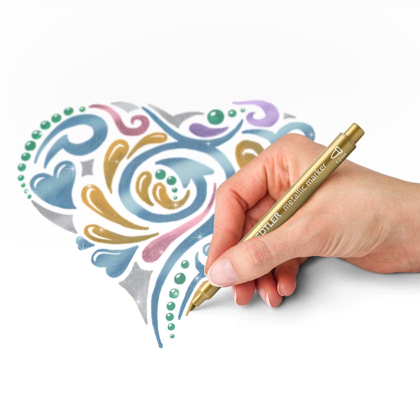 Fiberpenna Metallic Staedtler 8323. För skrivande och dekoration på ljust och mörkt papper samt på kort. Perfekt för scrapbooking och gratulationskort. Ingen pumpning eller skakning krävs.