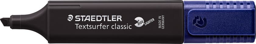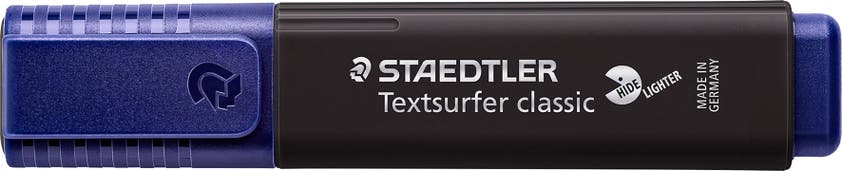 Svart överstrykningspenna Staedtler 364, som täcker text och linjer, men de är fortfarande läsbara - oläsliga efter kopiering. Staedtlers överstrykningspennor Textsurfer Classic med stor bläckreservoar för extra lång hållbarhet.