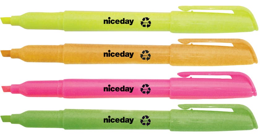 De smala överstykningspennorna Niceday är tillverkade av returplast. Med klips och rund pennform och med en snedskuren spets.