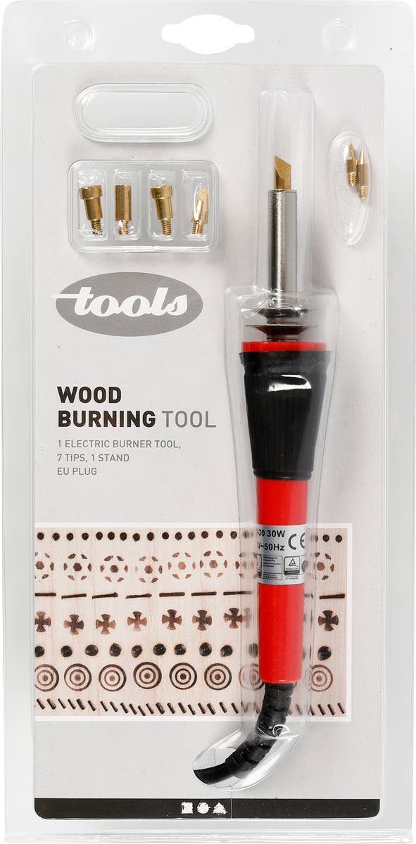 Brännpennan är ett elektriskt verktyg med utbytbar spets av metall till kork, läder och trä. Hållare och spets medföljer till motivavtryck och frihandsteckning. CE-märkt.