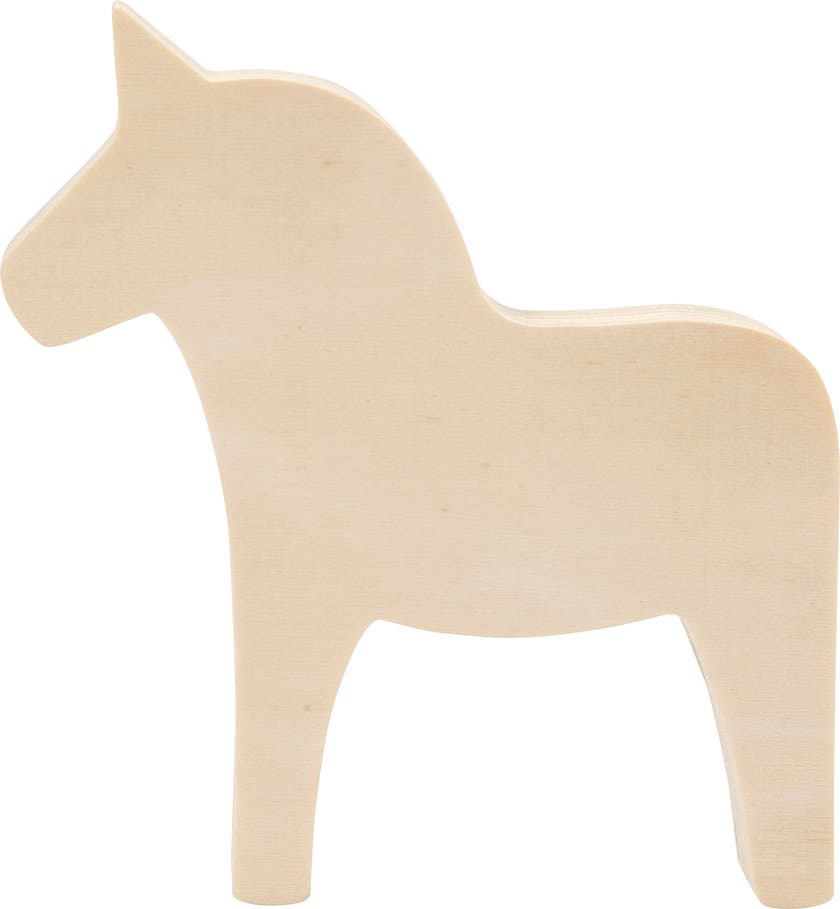 Ett kreativt pyssel. Häst i ljust trä och design inspirerad av den svenska dalahästen. Färglägg en egen designad Dalahäst eller en fantasi häst. Använd täckande färg, dekorativa märkpenor, klistra på pärlor, garn mm.