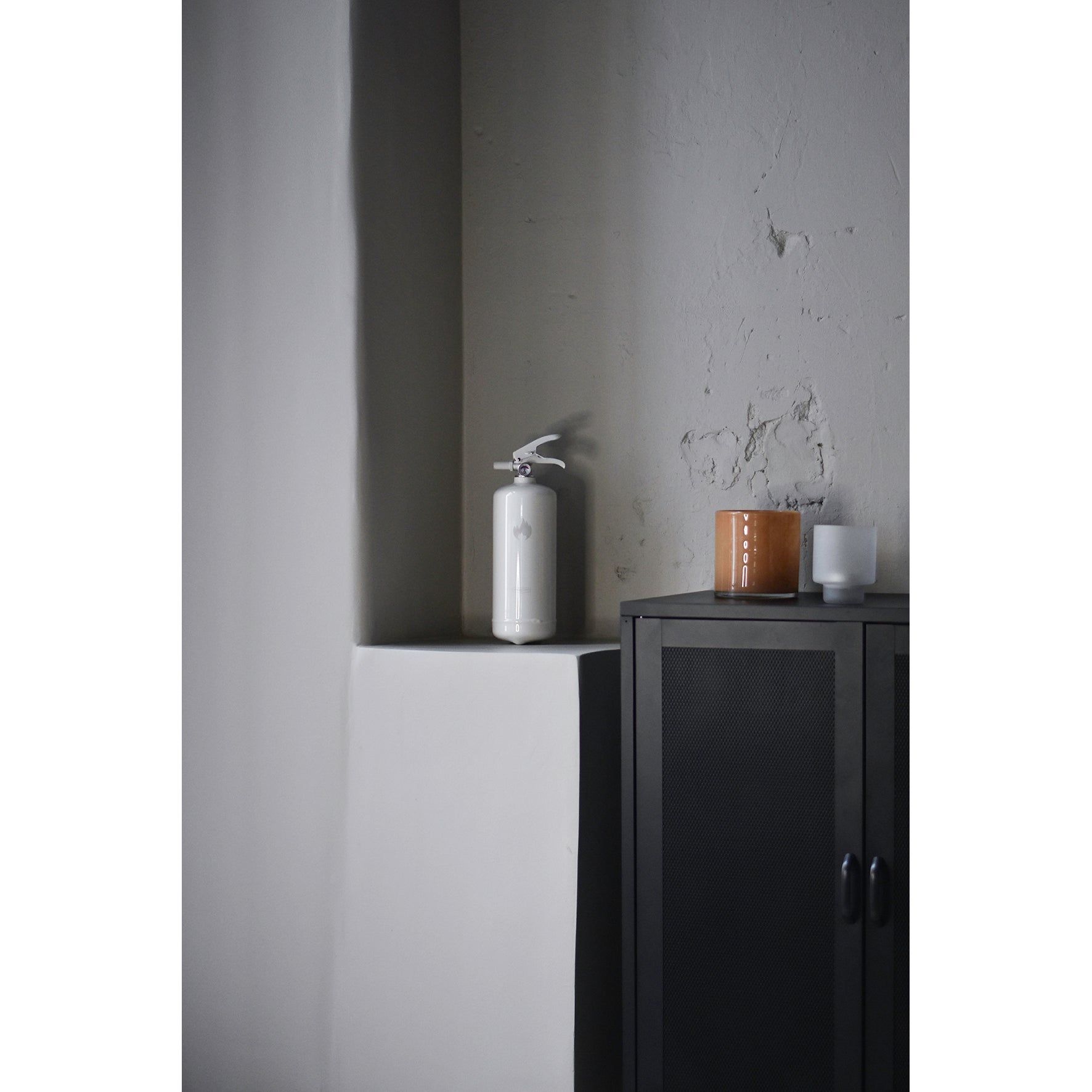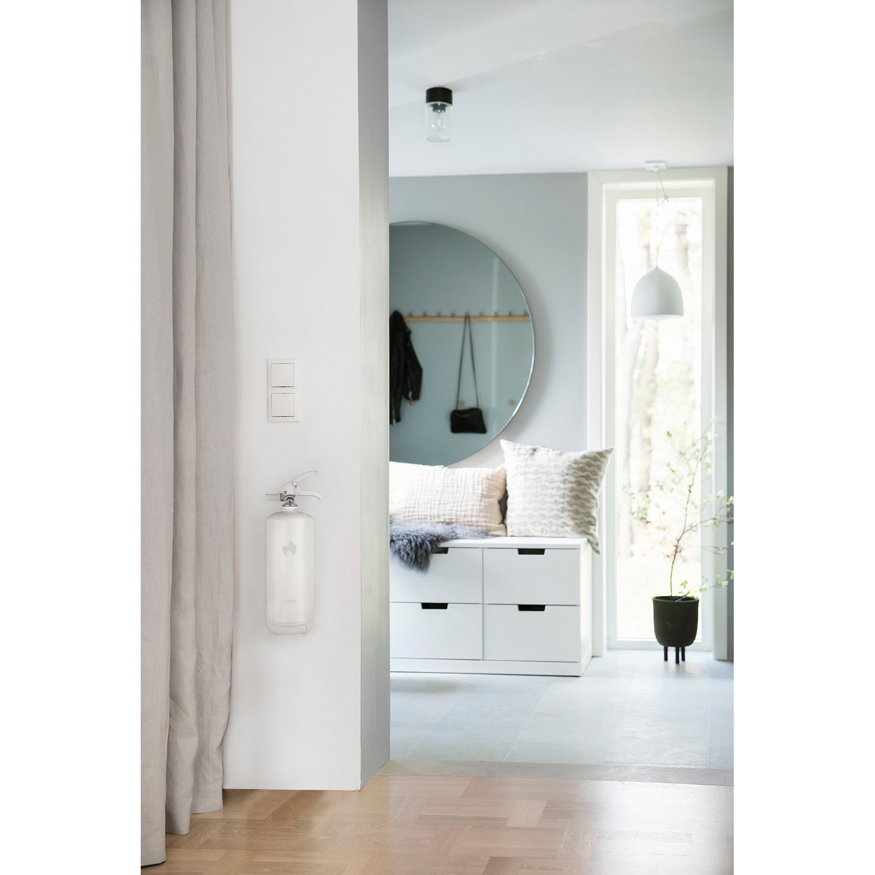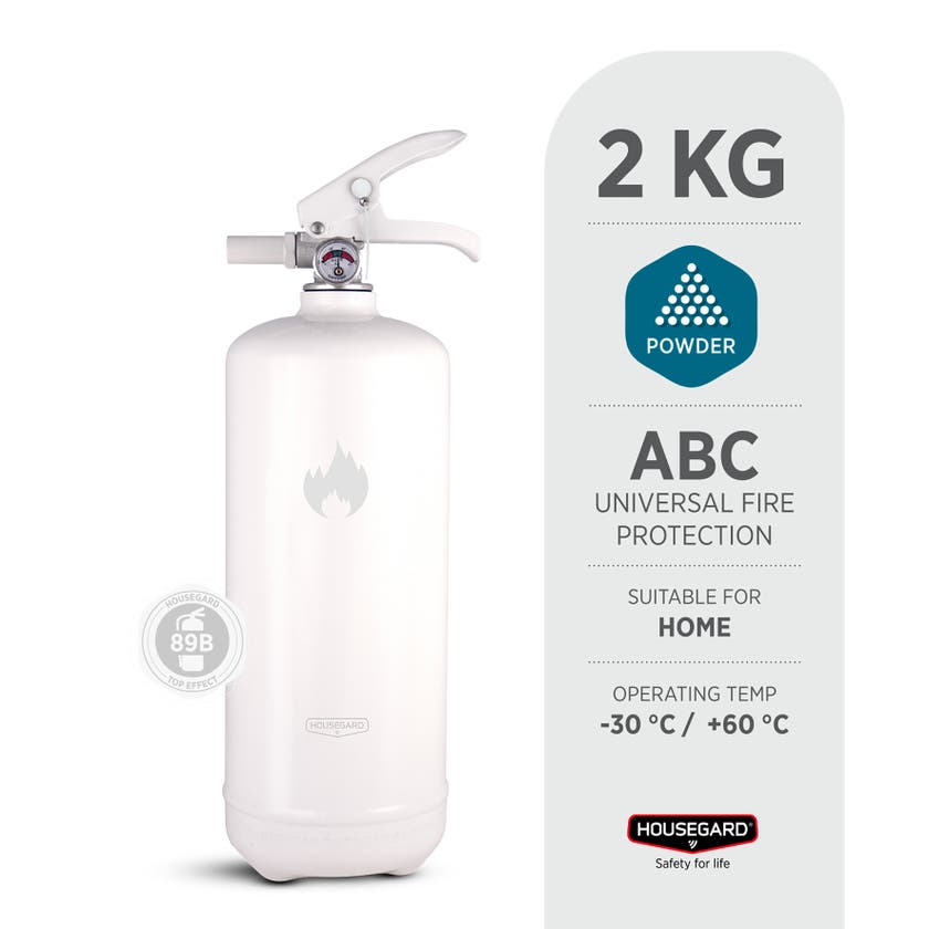 Den vita brandsläckaren smälter in i hemmet och blir en del av inredningen. Brandsläckarna i serien Design by Housegard är avsedda för hemmamiljöer, där användaren kan förväntas veta var släckaren är placerad.