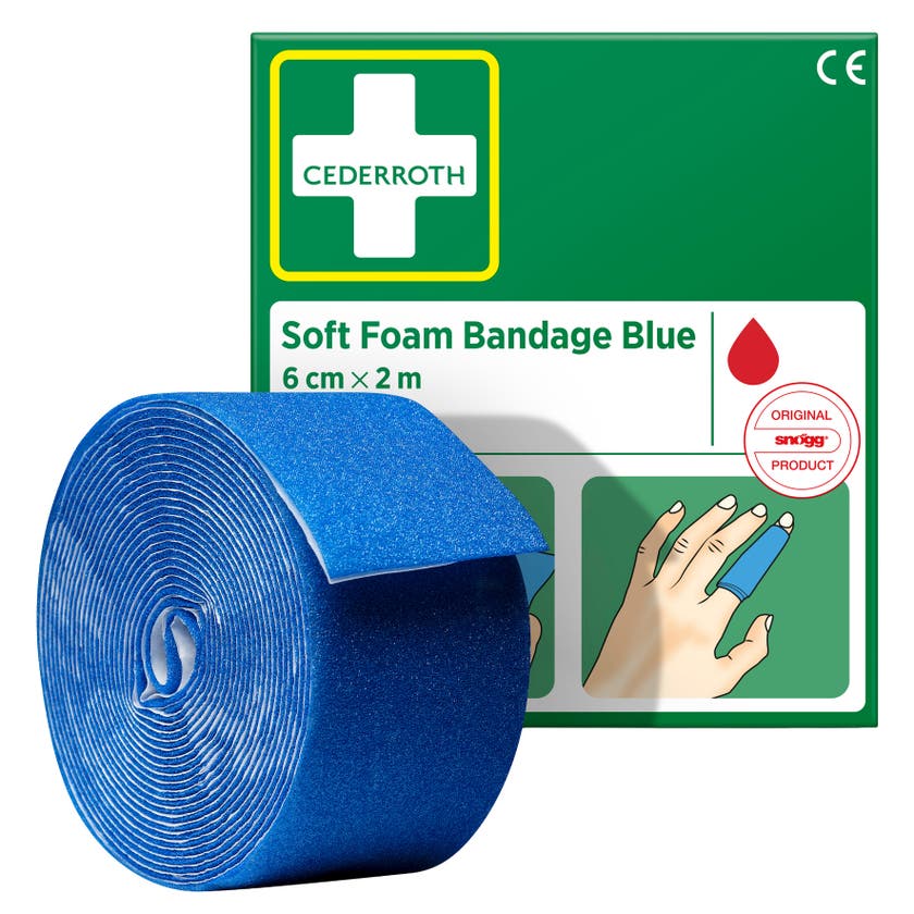 Cederroth Soft Foam Bandage Blue fungerar både som plåster och som bandage. Förbandet passar på alla typer av små sår oberoende av värme, kyla, vått eller torrt och sitter kvar även i vatten.