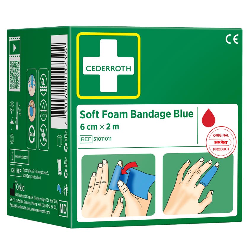 Cederroth Soft Foam Bandage är ett självhäftande limfritt plåster och klibbar därför inte fast i hud eller hår. Riv enkelt av en passande bit och linda runt det skadade området. Vid kraftig blödning forma en bit Soft Foam Bandage som en ”kudde” för att skapa ett tryckförband.