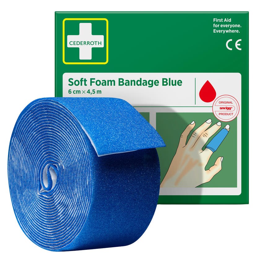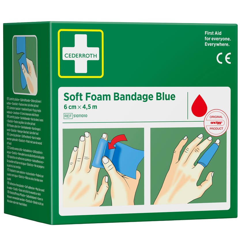 Cederroth Soft Foam Bandage är ett självhäftande limfritt plåster och klibbar därför inte fast i hud eller hår. Riv enkelt av en passande bit och linda runt det skadade området. Vid kraftig blödning forma en bit Soft Foam Bandage som en ”kudde” för att skapa ett tryckförband.