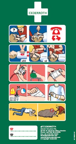 Första Hjälpen-instruktioner i form av tydliga och pedagogiska illustrationer.
