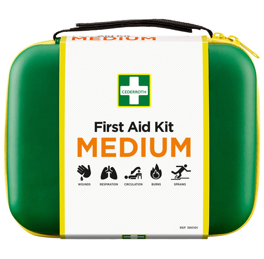 Cederroth First Aid Kit Medium är ett bra komplement till väggfast utrustning för verksamheter som ofta är på språng. Det är lätt att bära med sig och har ett justerbart kardborrhandtag. Väskan är gjord i ett tåligt formpressat material som tål tuffa tag och skyddar innehållet mot damm och smuts. Väskan kan bredas ut på marken för bättre överblick, rodukterna är förpackade i transparenta plastfickor vilket gör det lätt att hitta rätt produkt när varje sekund räknas.