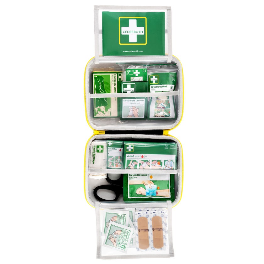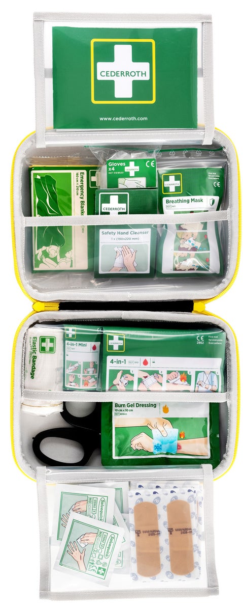 Första Hjälpen-utrustning som alltid finns till hands – redo att användas. Cederroths Första Hjälpen-Kits med ny design i signalfärger och förbättrad användarvänlighet, de är också utrustade med välbeprövade produkter som är enkelt utformade och försedda med tydliga instruktioner. Signalfärger i grönt och gult gör väskan synlig på långt håll.