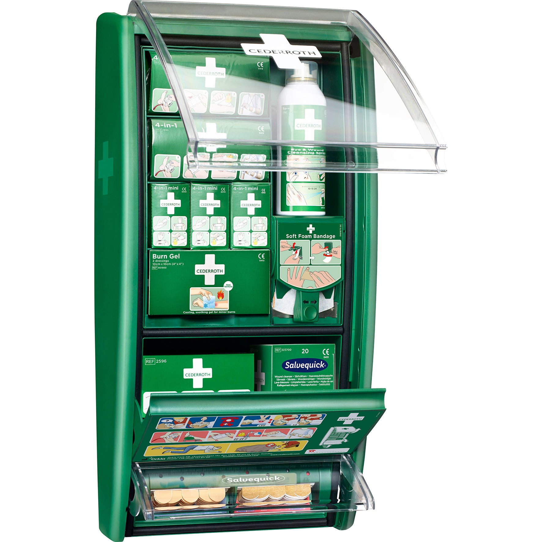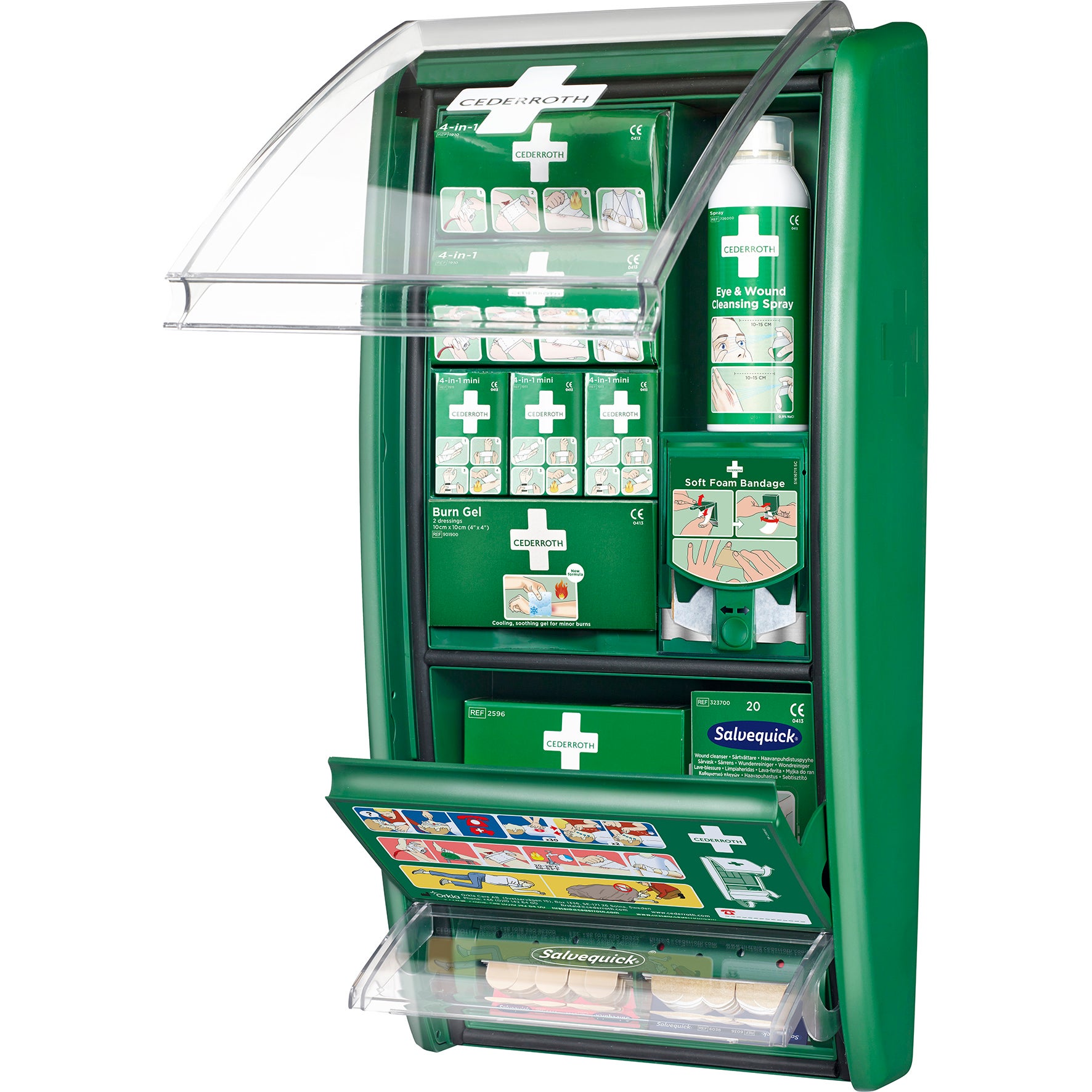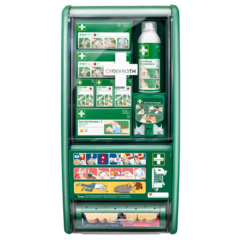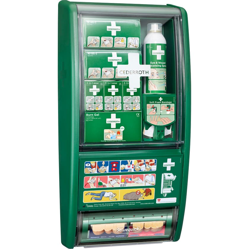 Cederroths Första hjälpen station. Första Hjälpen tavla med produkter för de flesta typer av skador.