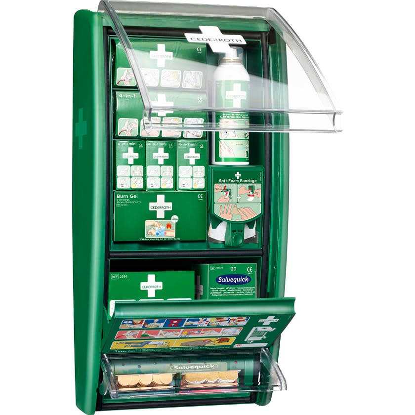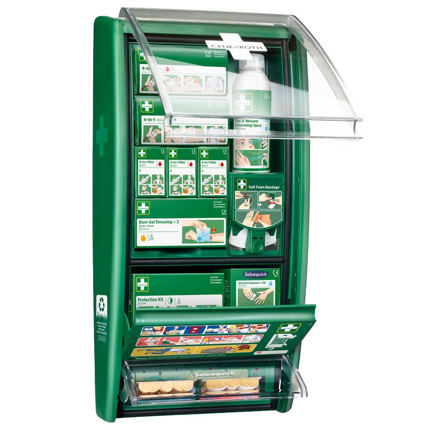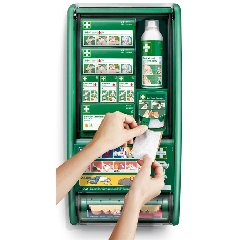 Innehåller bl.a.brännskadekompresser, ögon- och sårtvätts spray och nu även integrerad Soft Foam Dispenser - Nyhet! Transparent lucka skyddar mot damm och fukt. Plåsterautomat med refillnyckel. Extra förvaringsutrymme för eget tillval av produkter.