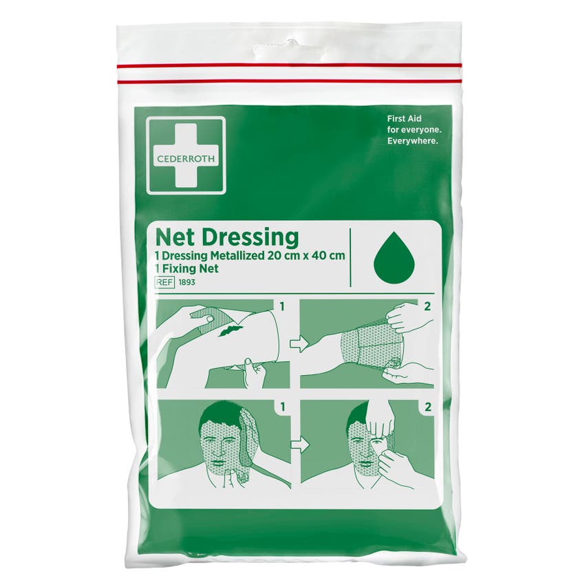 Avsedd för skador på huvudet, lämpligt även för att lägga förband på armar och ben. Sterilt förband med metalliserad yta som inte fastnar i sår. Förbandet hålls på plats genom ett tubformat elastiskt fästnät.