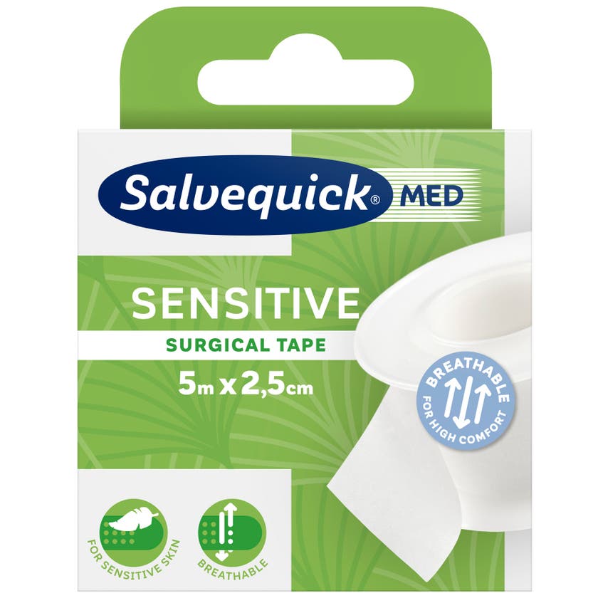 Kirurgtape Sensitive från Salvequick är en hudvänlig kirurgtejp som passar känslig hud och som låter huden andas. Lämplig för fixering av kompress/ förband eller direkt över mindre sår. Hypoallergent.