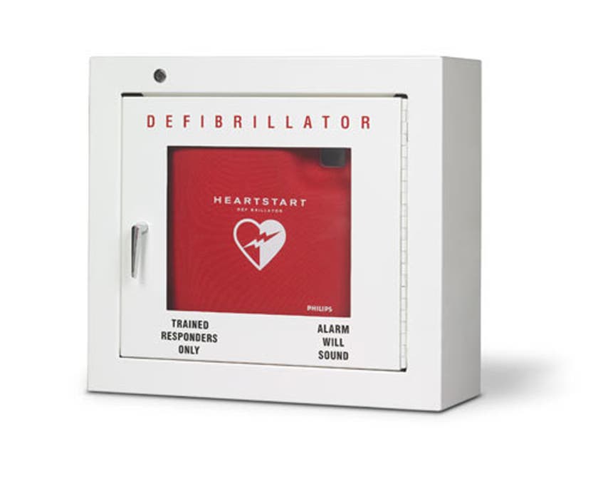 Vitt skåp som har plats för en AED med eller utan väska.
