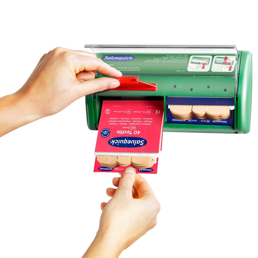Plåsterautomaten Salvequick (4907) är av hårdplast med lucka för skydd mot damm och fukt.