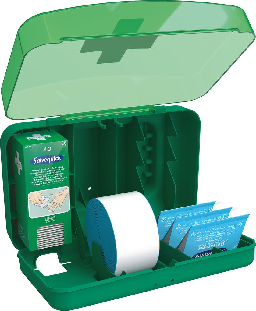 Innehåller en större mängd blå detekterbara plåster, sårtvättare samt Soft Foam Bandage Blue ett självhäftande limfritt plåster som sitter kvar även i vatten. Produkterna är fastlåsta vilket förhindrar svinn.