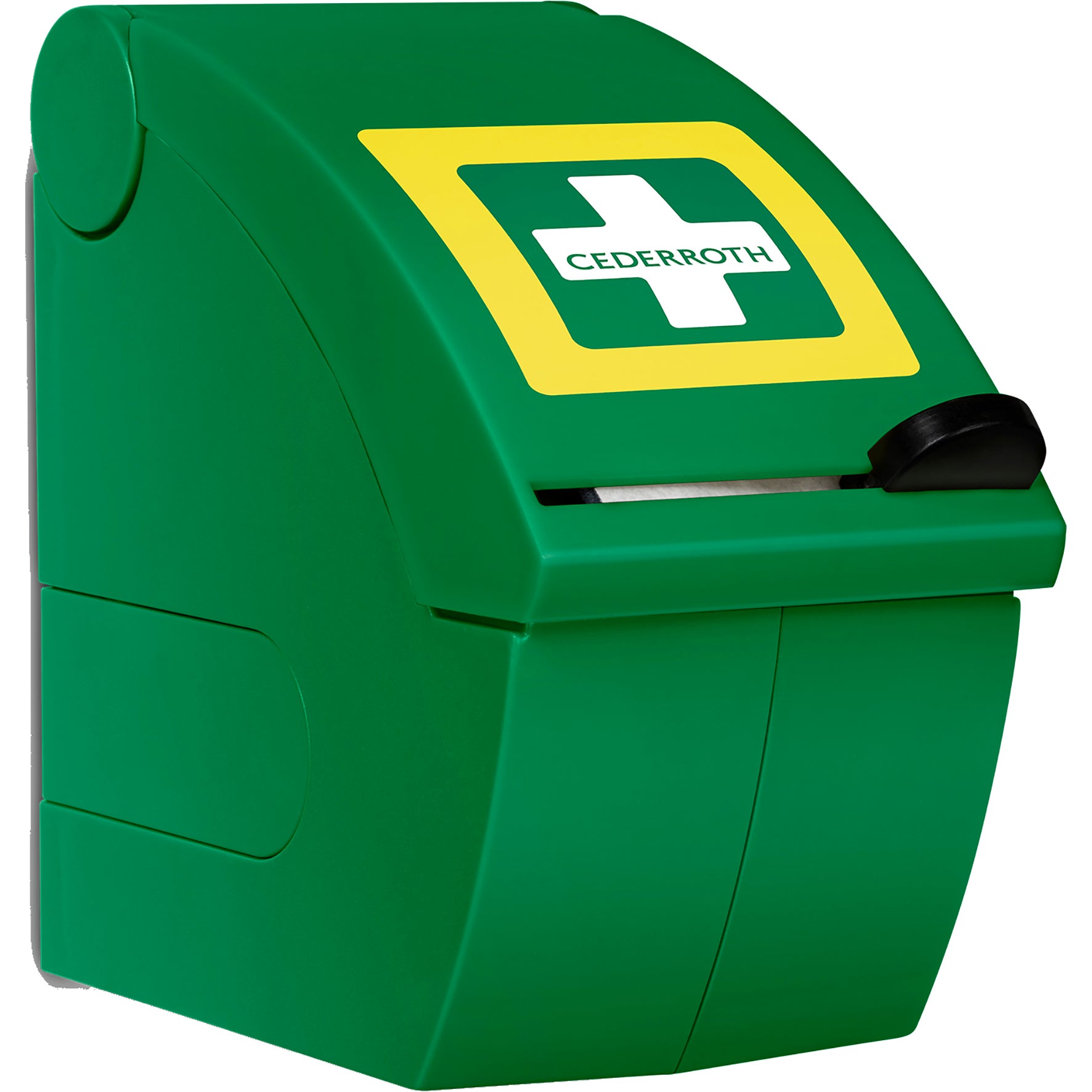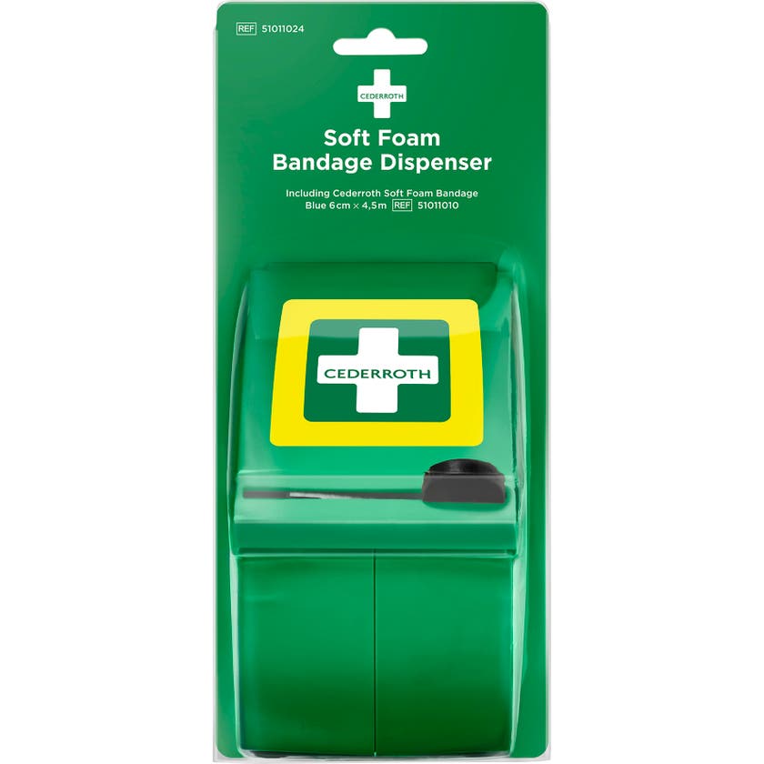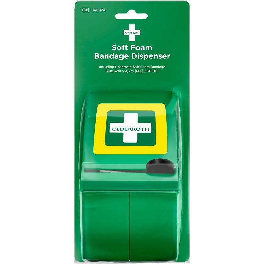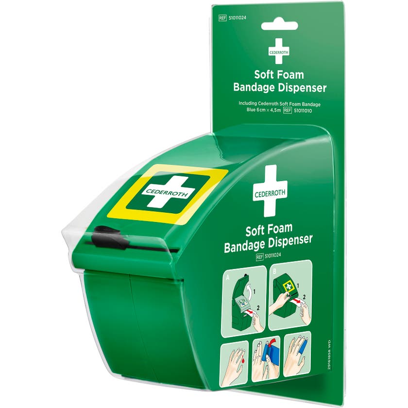 Dispenser med vägghållare för Soft Foam Bandage 4,5 meter x 6 cm. Levereras fylld med Cederroth Soft Foam Bandage Blue 6 cm x 4,5 meter (REF 51011010).