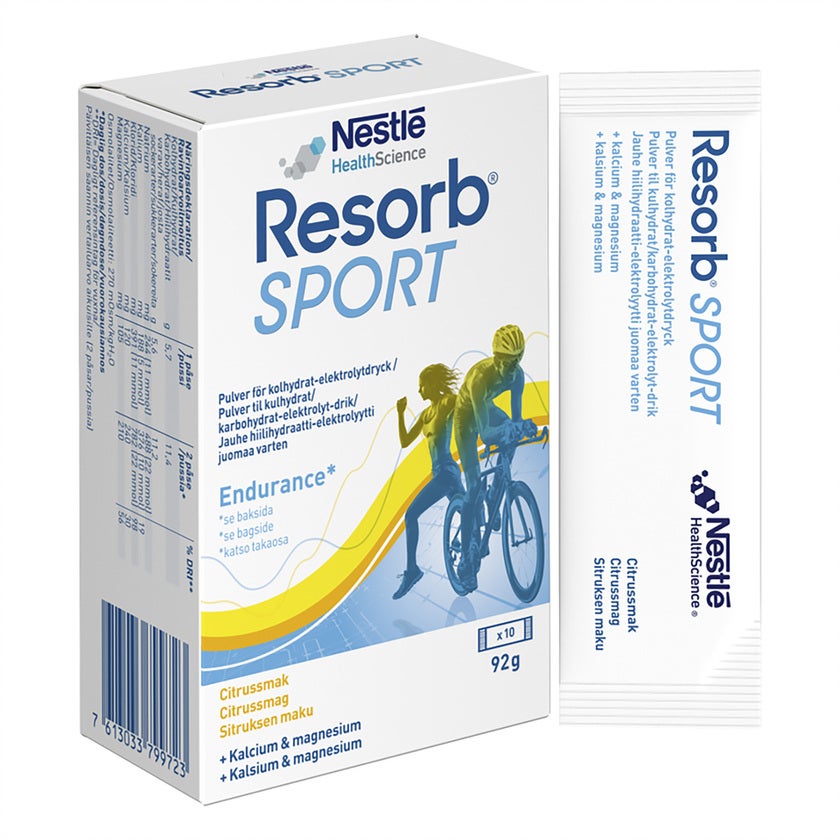 Vätskeersättning Resorb dospåse SportCitrus. Vätskeersättning med kalcium och magnesium för daglig träning. Resorb® Sport är en kolhydrat-elektrolytlösning som förbättrar vattenupptaget vid fysisk träning och bidrar till att bibehålla uthållighetsprestationen under långvarig uthållighetsträning. Resorb® Sport innehåller kalcium och magnesium som bidrar till normal muskelfunktion. Magnesium bidrar även till att minska trötthet och utmattning.