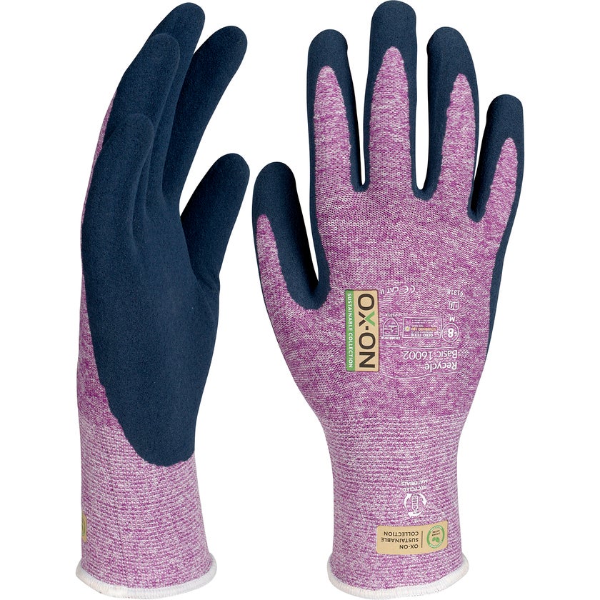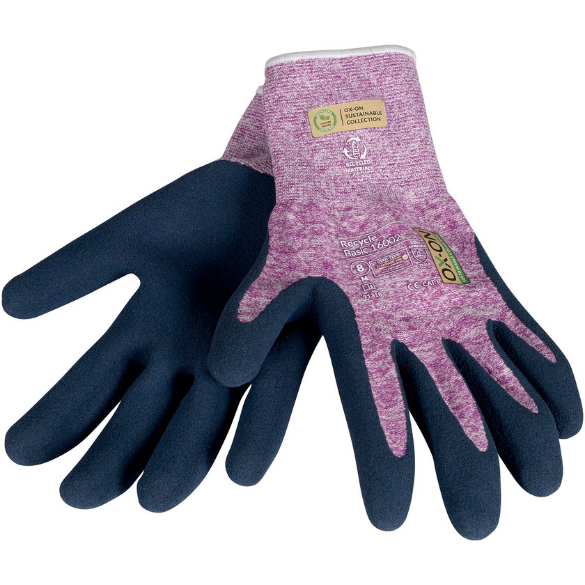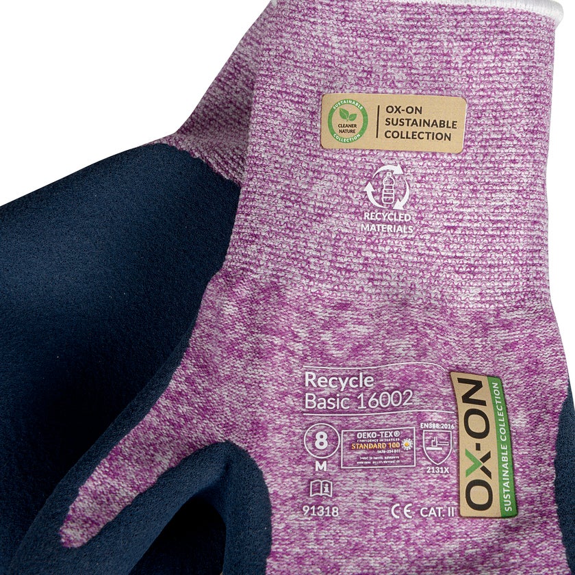 Trädgårdshandske / Hobyhandske OX-ON Recycle Basic 16002 - Är handsken för dig som behöver en smidig och bekväm handske för trädgård och hobby. 50 % av handskens stickning är gjord av återvunnen polyester. Dessutom är handsken ”OekoTex-certifierad”, så du är garanterad en miljövänlig handske utan skadliga kemikalier och färgämnen.