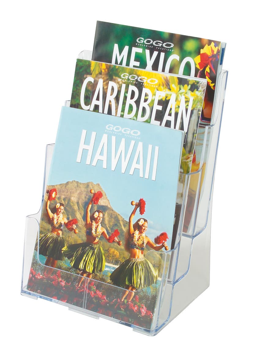 För exponering av "flyers", broschyrer, tidskrifter mm. Office Depots broschyrfack för olika stående format för disk eller väggmontering.