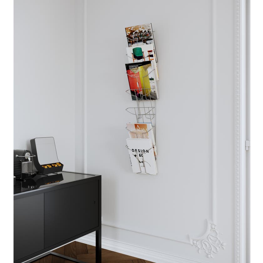 Detta broschyrställ för vägg är idealiskt för receptioner, väntrum, korridorer och andra gemensamma ytor där information behöver visas överskådligt. Den robusta trådkonstruktionen ger lång hållbarhet, medan den minimalistiska designen gör att stället smälter in i de flesta miljöer och låter materialet stå i fokus.