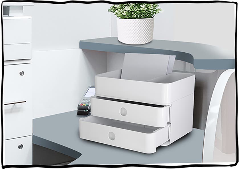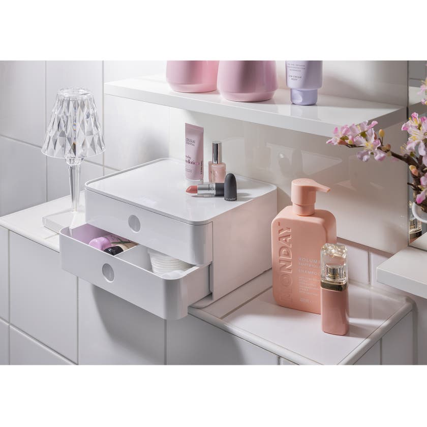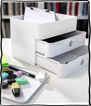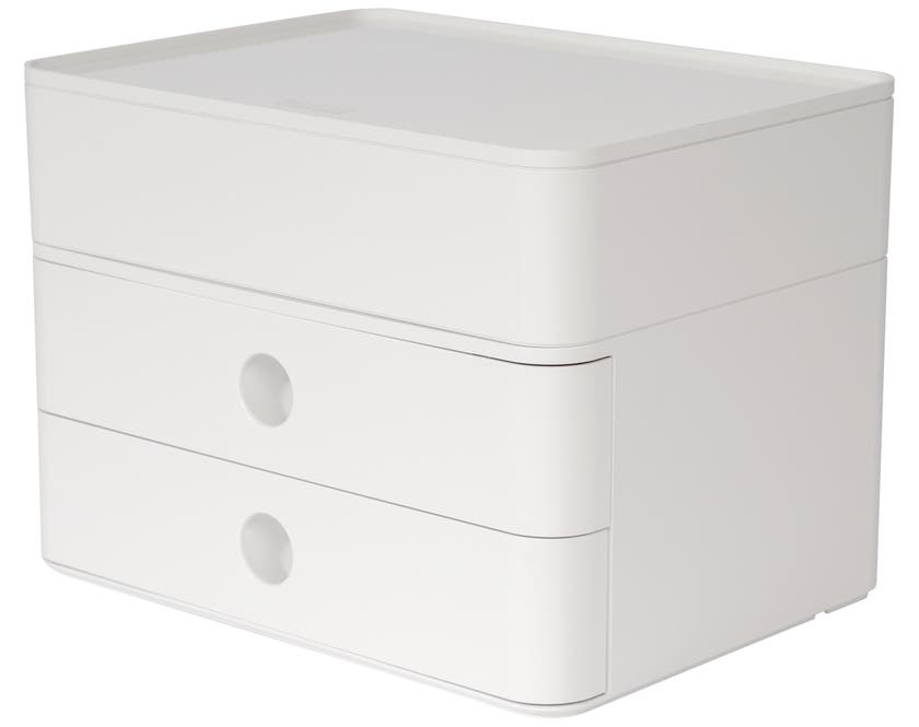 Förvaringsenheten Allison Smart-Box plus från HAN, är en stapelbar förvaringsbox med 2 utdragbara lådor och 2 redskapslådor och 1 bricka. Lådorna är utrustade med en avdelare, praktiskt när du behöver förvara mindre saker. Den större redskapslådan har en mindre flyttbar låda för förvaring och som avdelare. I botten finns 2 smarta kabelhållare. Alla delar går att använda separat eller tillsammans.