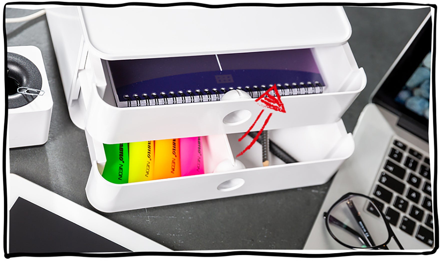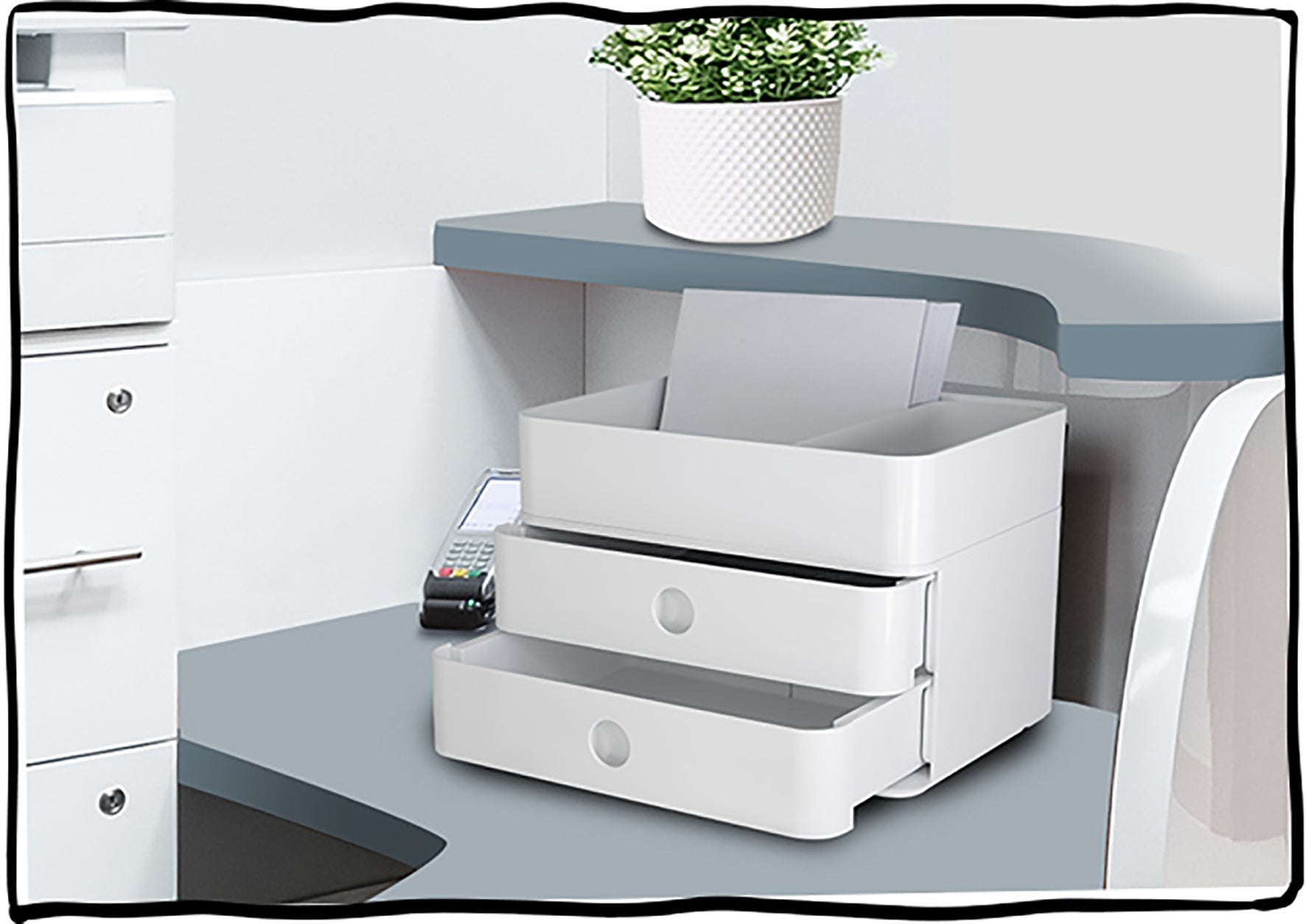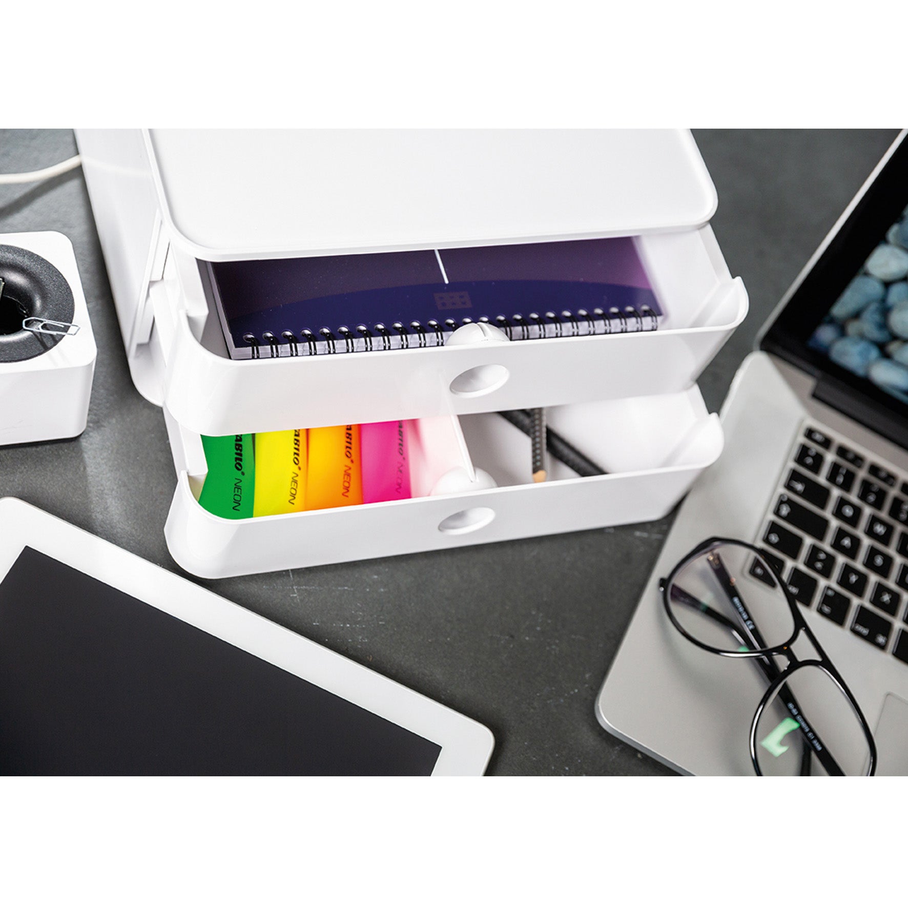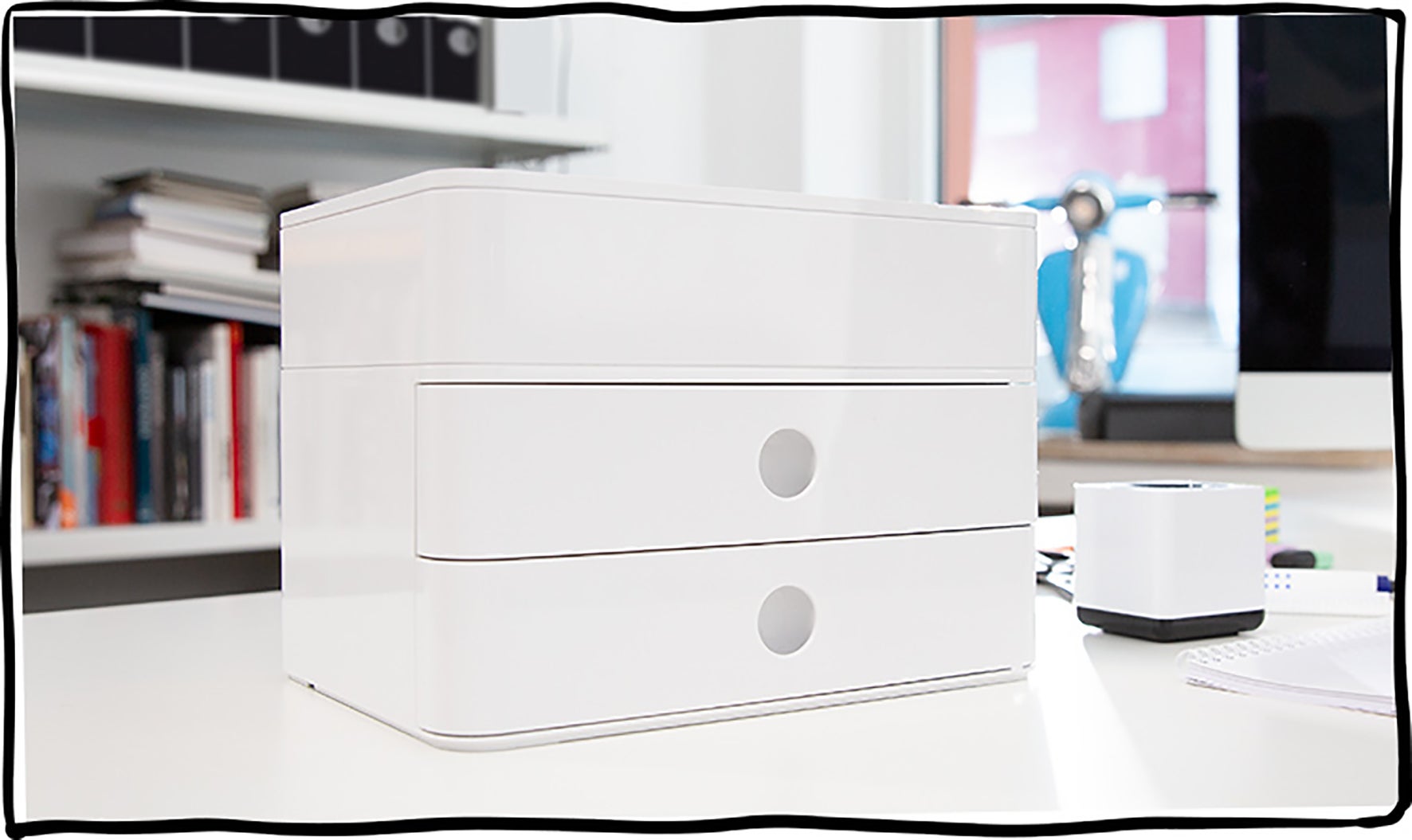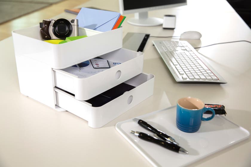 Unik och innovativ design i högglansig ABS-plast för olika användningsområden. Är lika användbar på kontoret, i mötet, fikaplatsen, spa, pyssel, leksaker mm. Användarvänlig i både torra och fuktiga miljöer. Är diskmaskins- och livsmedelssäker. Passar även till förvaring av te, socker, servetter, kaffekapslar, mjölk mm.
