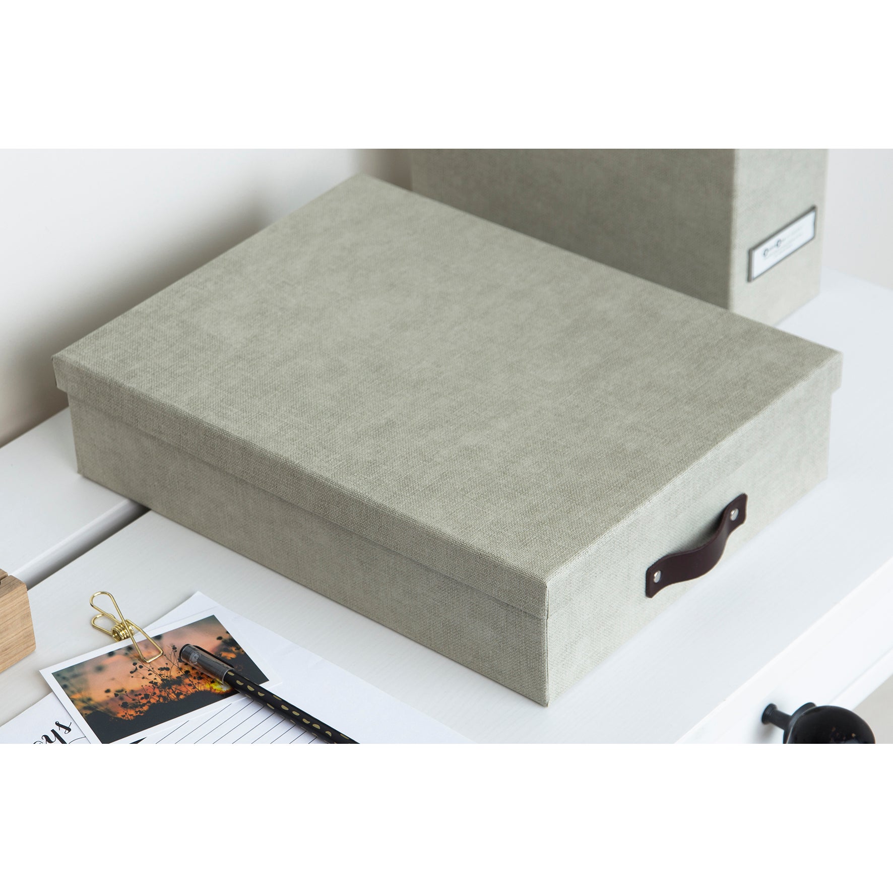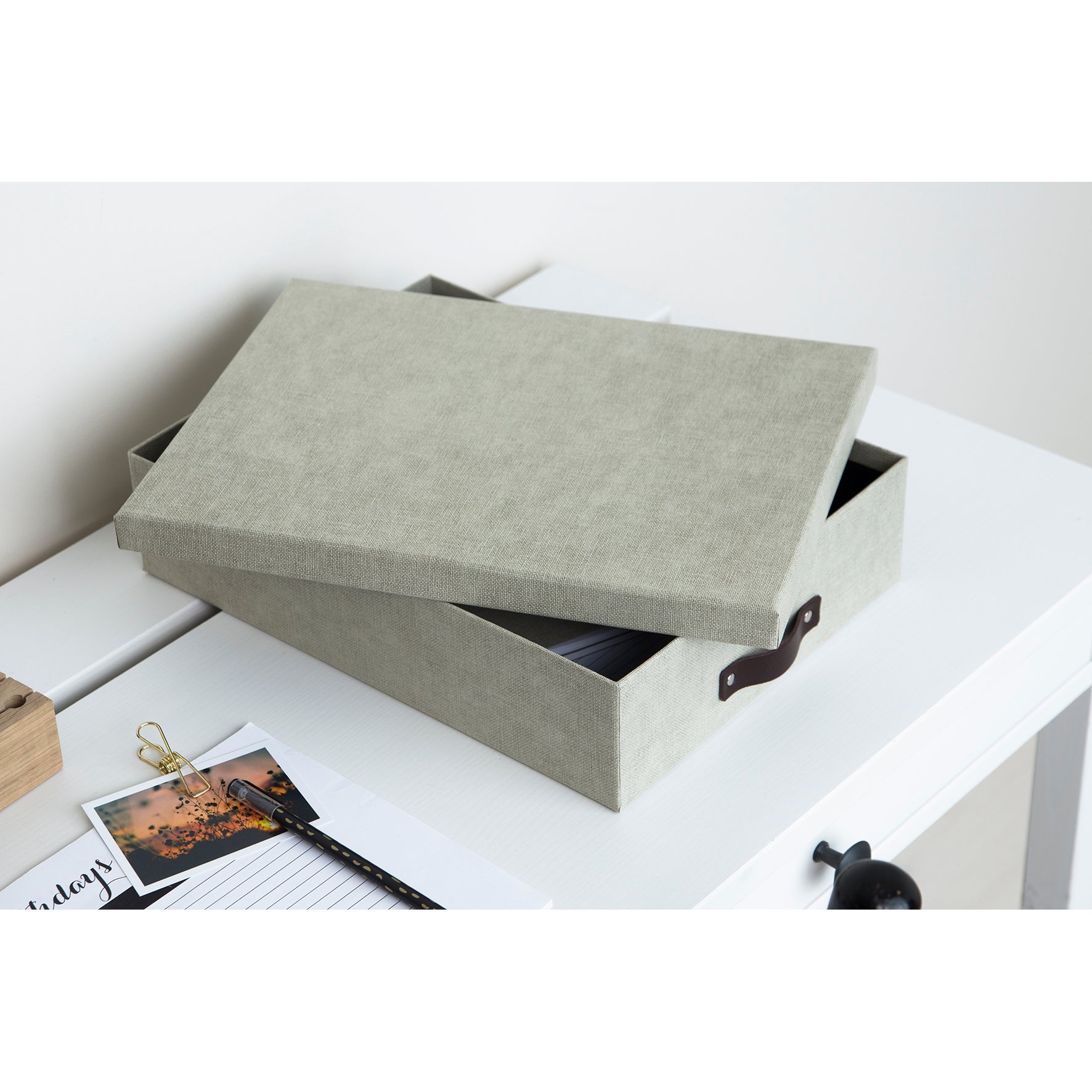 Tillverkad i återvunnen fiberboard med canvasstruktur. Match gärna med övriga lådor och fack i samma serie från Bigso.