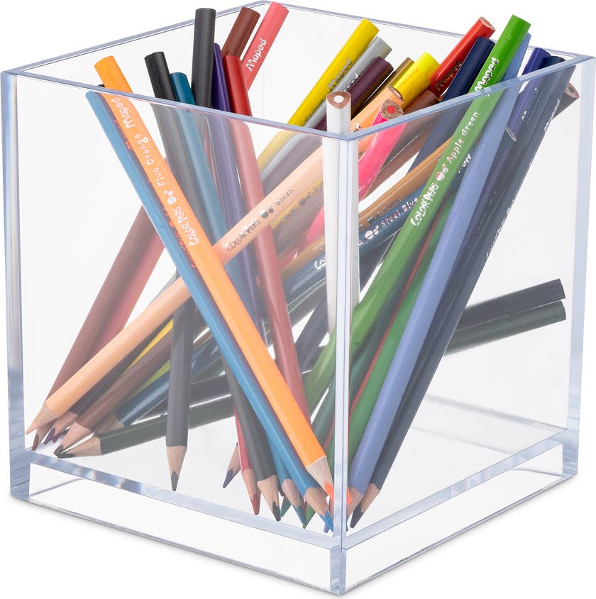 Förvaringsbox Palaset av högblank transparent akrylplast. Användbar till mycket allt som behöver samlas ihop på ett och samma ställe, tex: pennor, linjaler, penslar, saxar och det som används under dagen och behöver vara lätt tillgängligt.
