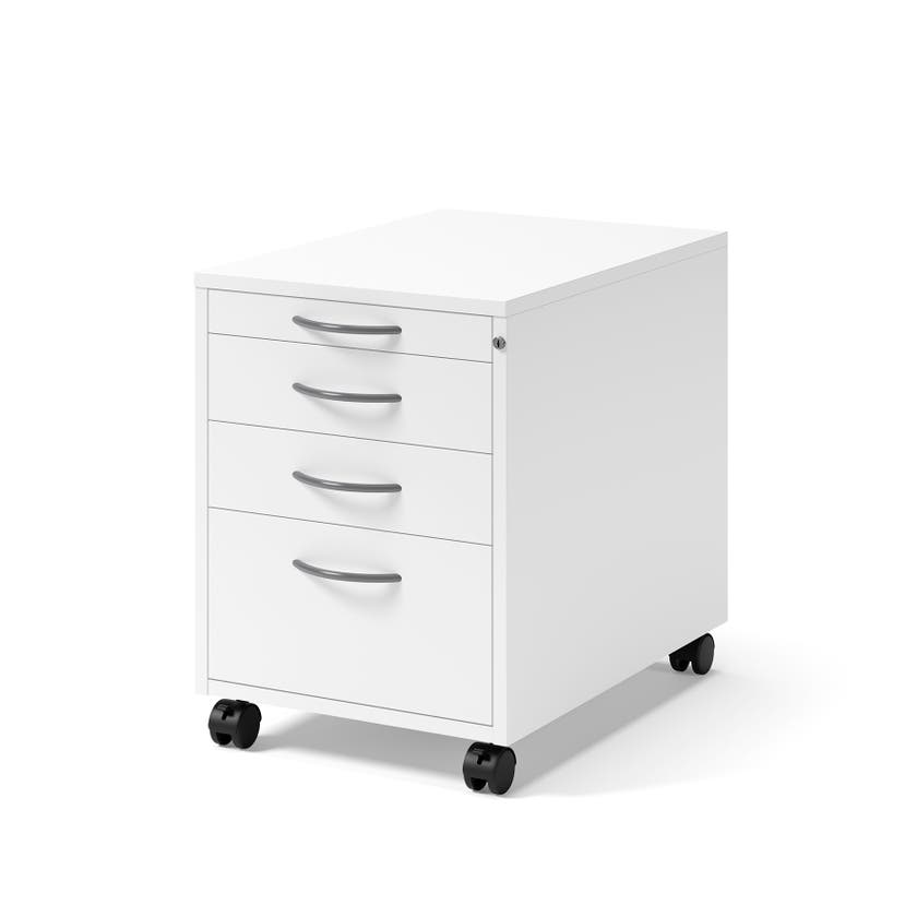 Rullhurts 4 lådor. Smart och flexibel förvaring. Hurts med fyra lådor, varav en mapplåda. Hurtsarna består av laminatbelagd spånskiva och finns i olika varianter och antal lådor. Alla hurtsar har penninsats och centrallås som standard.