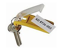 Nyckelbricka Keyclip med lock och med en väl synlig och utbytbar etikett där nyckeln hänger bakom brickan.