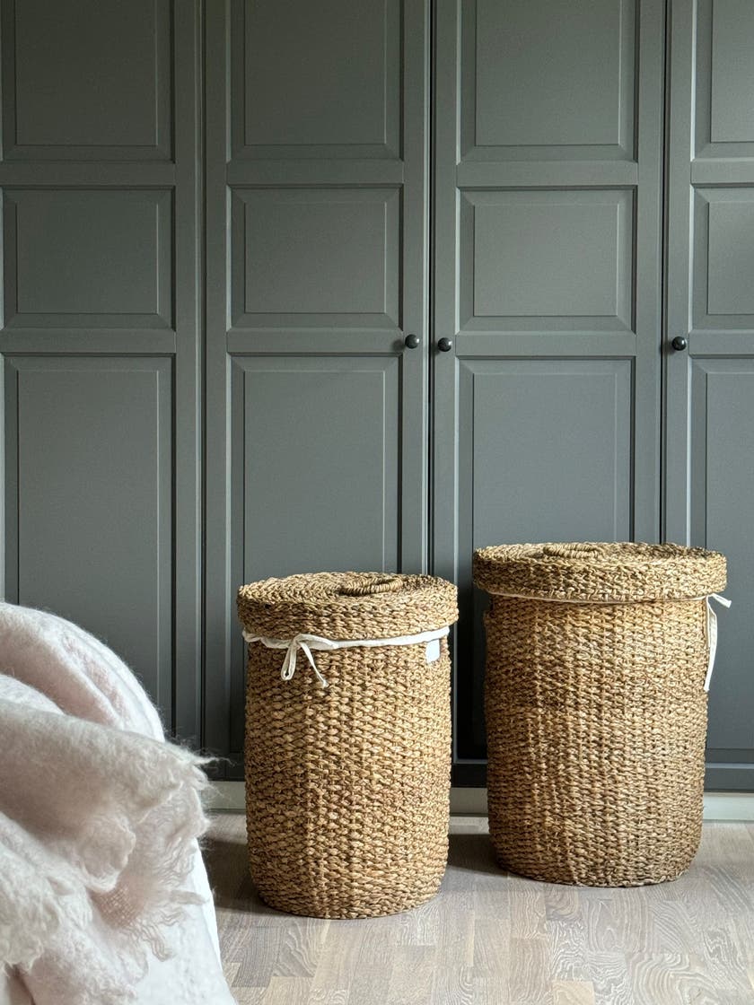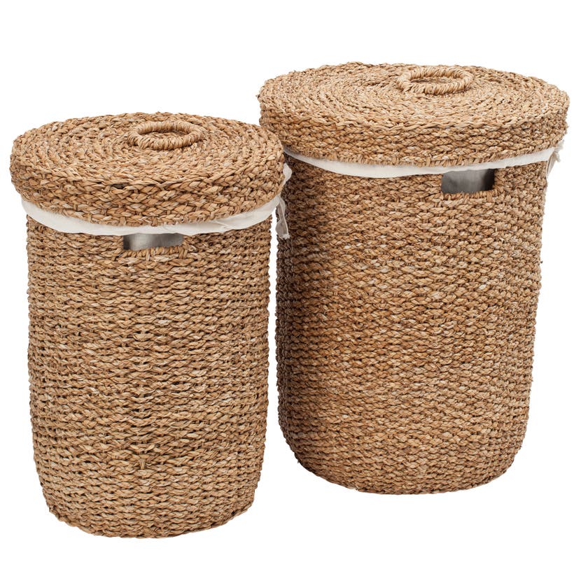 Runda korgar av sjögräs. Vacker och rejäl korg med lock. För dina saker som inte ska synas, tvätt mm. h60xd44cm, h55xd36cm. Korgarna har tyg invändigt. Perfekt tvättkorg. 2/set
