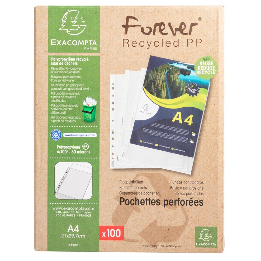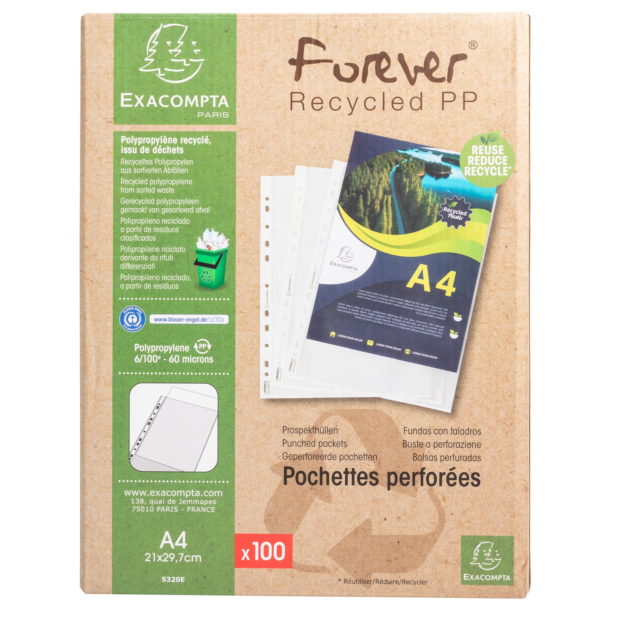 Plastfickor i präglat utförande, tillverkade av återvunnen PP. Förstärkt, stansad remsa för användning i ringpärmar. Miljömärkt enligt Blue Angel.